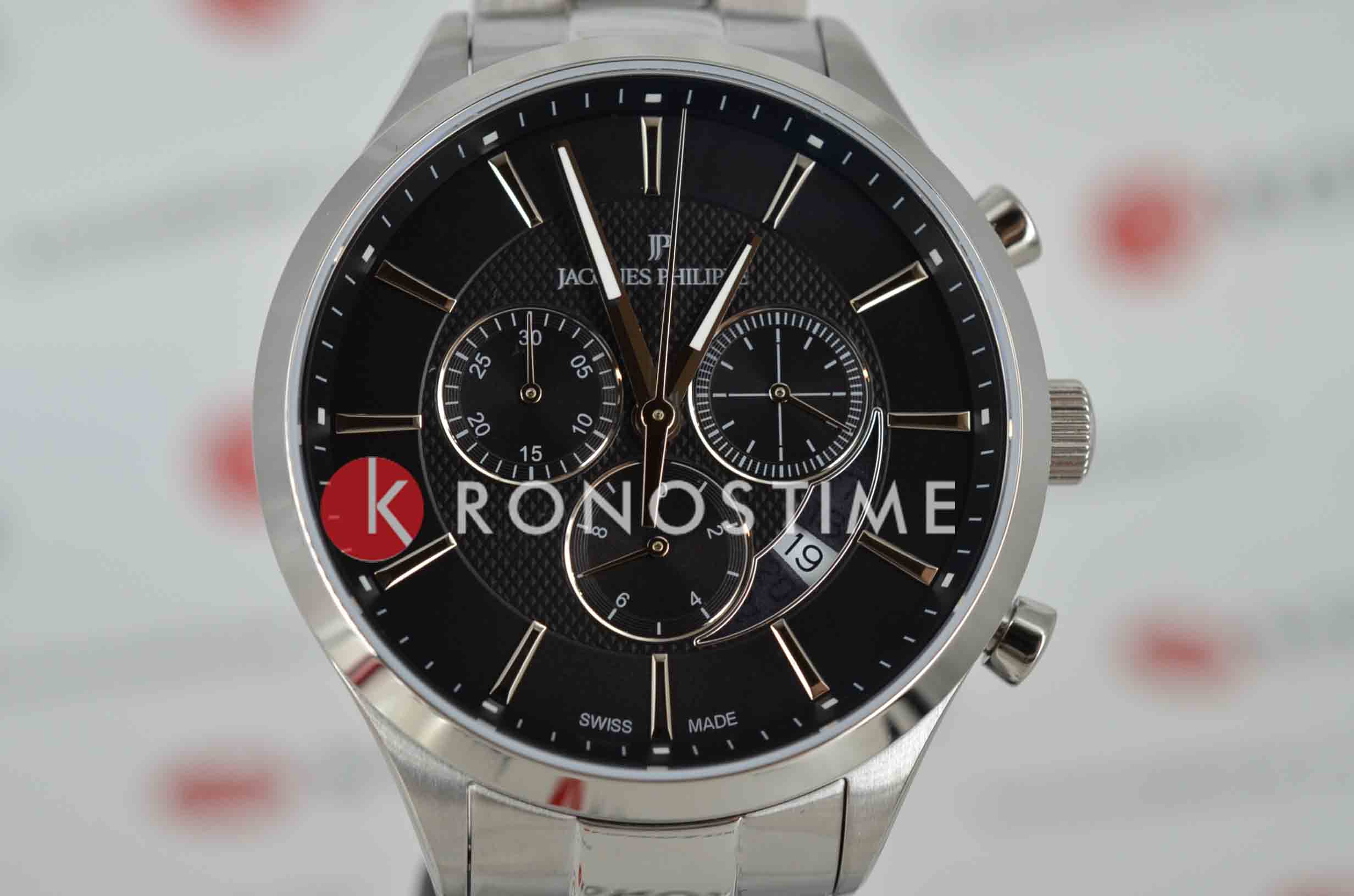 Швейцарские мужские часы-хронографХронографФункция позволяет измерять отрезки времени с особой точностью: часы, минуты, секунды. Верным признаком хронографа является наличие на циферблате 3 дополнительных окошек-счётчиков. Jacques Philippe Gallant JPQGC031316, кварцевый механизм с высокой точностью. Сапфировое стеклоСапфировое стеклоПрочный и надёжный материал из кристалла сапфира синтетического происхождения, характеризующийся особой твёрдостью и устойчивостью к царапинам и повреждениям. устойчивое к появлению царапин, обладающее высокой прозрачностью. Корпус часов изготовлен из нержавеющей стали. На циферблате три дополнительных индикатора. Стрелки с люминесцентным покрытиемЛюминесцентное покрытиеПозволяет считывать показания времени в темноте. Производители наносят на стрелки, часовые индексы, безель или поверхность циферблата светонакопительный состав, дающий холодное свечение.. Окошко даты находится между 4 и 5 часами. Класс водозащиты: 50 метров, позволит защитить корпус от случайных брызг или капель дождя. Стальной браслет на застёжке «бабочка» с кнопкамиЗастёжка "бабочка"Такой вид застёжки дополняется предохранителями, помогающими избежать случайного раскрытия браслета. Обладают изящным исполнением. .
