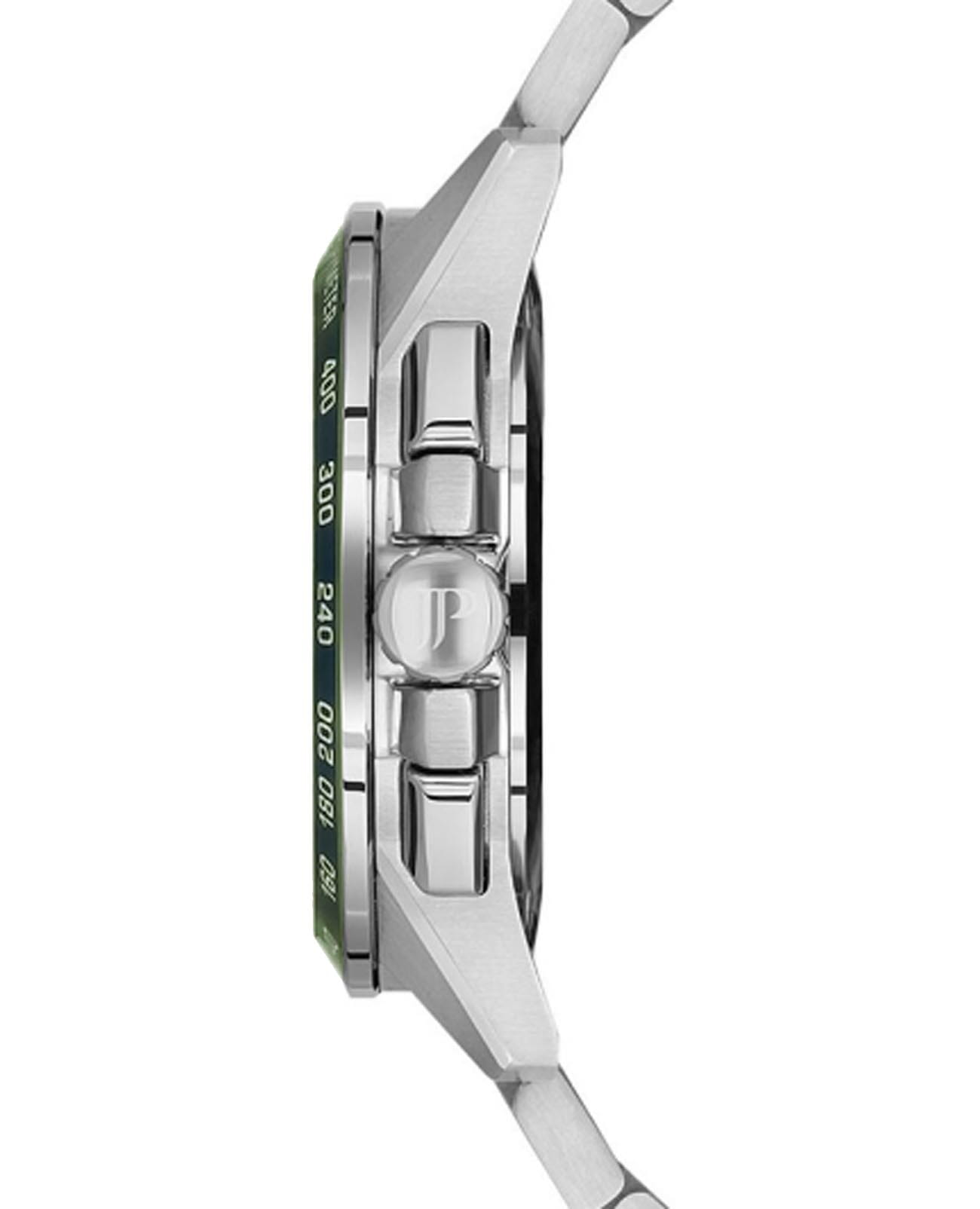 Швейцарские мужские часы-хронографХронографФункция позволяет измерять отрезки времени с особой точностью: часы, минуты, секунды. Верным признаком хронографа является наличие на циферблате 3 дополнительных окошек-счётчиков. с секундомеромСекундомерСекундоме́р — прибор, способный измерять интервалы времени с точностью до долей секунды. Jacques Philippe Magnificus JPQGC2513X6, кварцевый механизм с высокой точностью. Сапфировое стеклоСапфировое стеклоПрочный и надёжный материал из кристалла сапфира синтетического происхождения, характеризующийся особой твёрдостью и устойчивостью к царапинам и повреждениям. устойчивое к появлению царапин, обладающее высокой прозрачностью. Корпус часов изготовлен из нержавеющей стали. БезельБезельВнешний ободок, закрепляющий стекло. В спортивных часах так называется поворотное кольцо с делениями на циферблате, выполняет роль таймера – замеряет отрезки времени на шкале. Неподвижный безель – элемент декора. Однонаправленно вращающийся безель на дайверских часах позволяет фиксировать моменты погружения и выныривания на поверхность. с IP-покрытиемIP-покрытиеМетод ионного напыления. Демонстрирует повышенную устойчивость к истиранию, окислению и химическим веществам. Под воздействием высокого давления и температуры около 1500°C молекулы металла надёжно соединяются с частицами корпуса часов. с тахиметромТахиметрРазмеченная шкала, располагается на ободке или безеле часов. Тахиметр позволяет рассчитать скорость на определённом участке пути, расстояние измеряется в километрах или милях.. На циферблате три дополнительных индикатора. Окошко даты находится в положении 6 часов. Стрелки с люминесцентным покрытиемЛюминесцентное покрытиеПозволяет считывать показания времени в темноте. Производители наносят на стрелки, часовые индексы, безель или поверхность циферблата светонакопительный состав, дающий холодное свечение.. Класс водозащиты: 100 метров, позволит плавать, нырять и заниматься другими водными видами спорта. Стальной браслет на застёжке-бабочке.