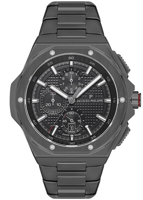 Швейцарские мужские часы-хронографХронографФункция позволяет измерять отрезки времени с особой точностью: часы, минуты, секунды. Верным признаком хронографа является наличие на циферблате 3 дополнительных окошек-счётчиков. с секундомеромСекундомерСекундоме́р — прибор, способный измерять интервалы времени с точностью до долей секунды. Jacques Philippe Esquire JPQGC488317, кварцевый механизм с высокой точностью. Сапфировое стеклоСапфировое стеклоПрочный и надёжный материал из кристалла сапфира синтетического происхождения, характеризующийся особой твёрдостью и устойчивостью к царапинам и повреждениям. устойчивое к появлению царапин, обладающее высокой прозрачностью. Корпус часов изготовлен из нержавеющей стали 316L с PVD-покрытиемPVDУльтратонкое покрытие наносится в технике вакуумного напыления, сочетает в себе нитрид титана особой прочности со слоем золота или оксида хрома. Несёт в себе декоративную или защитную функцию.. На циферблате три дополнительных индикатора. Стрелки и метки с люминесцентным покрытиемЛюминесцентное покрытиеПозволяет считывать показания времени в темноте. Производители наносят на стрелки, часовые индексы, безель или поверхность циферблата светонакопительный состав, дающий холодное свечение.. Шкала тахиметраТахиметрРазмеченная шкала, располагается на ободке или безеле часов. Тахиметр позволяет рассчитать скорость на определённом участке пути, расстояние измеряется в километрах или милях. на циферблате. Класс водозащиты: 50 метров, позволит защитить корпус от случайных брызг или капель дождя. Стальной браслет с PVD-покрытиемPVDУльтратонкое покрытие наносится в технике вакуумного напыления, сочетает в себе нитрид титана особой прочности со слоем золота или оксида хрома. Несёт в себе декоративную или защитную функцию. на застёжке «бабочка»Застёжка "бабочка"Такой вид застёжки дополняется предохранителями, помогающими избежать случайного раскрытия браслета. Обладают изящным исполнением. .