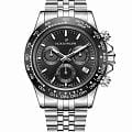 Швейцарские наручные часы Jacques Philippe JPQGC711316SBB сочетают в себе современный дизайн, надежность и функциональность, это стильные швейцарские часы с функцией хронографаХронографФункция позволяет измерять отрезки времени с особой точностью: часы, минуты, секунды. Верным признаком хронографа является наличие на циферблате 3 дополнительных окошек-счётчиков. и секундомераСекундомерСекундоме́р — прибор, способный измерять интервалы времени с точностью до долей секунды.. Корпус круглой формы диаметром 39 мм выполнен из прочной нержавеющей стали, а безельБезельВнешний ободок, закрепляющий стекло. В спортивных часах так называется поворотное кольцо с делениями на циферблате, выполняет роль таймера – замеряет отрезки времени на шкале. Неподвижный безель – элемент декора. Однонаправленно вращающийся безель на дайверских часах позволяет фиксировать моменты погружения и выныривания на поверхность. с элегантным черным IP-покрытиемIP-покрытиеМетод ионного напыления. Демонстрирует повышенную устойчивость к истиранию, окислению и химическим веществам. Под воздействием высокого давления и температуры около 1500°C молекулы металла надёжно соединяются с частицами корпуса часов., а сапфировое стеклоСапфировое стеклоПрочный и надёжный материал из кристалла сапфира синтетического происхождения, характеризующийся особой твёрдостью и устойчивостью к царапинам и повреждениям. надежно защищает черный циферблат от царапин и повреждений. Модель оснащена точным кварцевым механизмом RONDA 5030.D-4H, а также дополнительными функциями — тахиметромТахиметрРазмеченная шкала, располагается на ободке или безеле часов. Тахиметр позволяет рассчитать скорость на определённом участке пути, расстояние измеряется в километрах или милях. и индикатором даты, что делает часы не только стильным аксессуаром, но и практичным помощником на каждый день. Серебристый браслет шириной 20 мм удобно фиксируется на запястье с помощью застежки «бабочка»Застёжка "бабочка"Такой вид застёжки дополняется предохранителями, помогающими избежать случайного раскрытия браслета. Обладают изящным исполнением. . Стрелки имеют люминесцентное покрытиеЛюминесцентное покрытиеПозволяет считывать показания времени в темноте. Производители наносят на стрелки, часовые индексы, безель или поверхность циферблата светонакопительный состав, дающий холодное свечение. для удобства чтения времени в темноте. Водозащита 5 АТМ позволяет не снимать часы при дожде и случайных контактах с водой.
