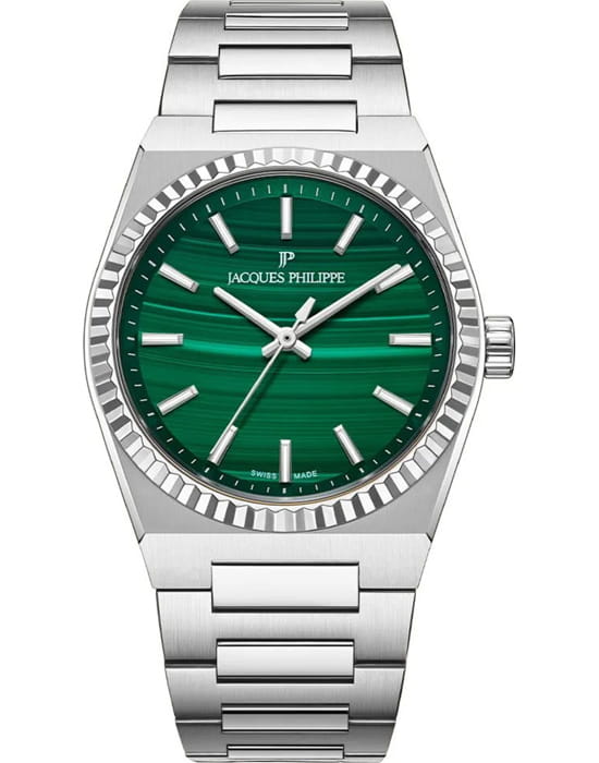 Часы Jacques Philippe JPQGLS5813X6MA из коллекции Borealis — элегантные женские часы, сочетающие в себе швейцарское качество и современный дизайн. Корпус диаметром 34 мм выполнен из нержавеющей стали, а зеленый циферблат защищён сапфировым стекломСапфировое стеклоПрочный и надёжный материал из кристалла сапфира синтетического происхождения, характеризующийся особой твёрдостью и устойчивостью к царапинам и повреждениям.. Внутри установлен швейцарский кварцевый механизм, обеспечивающий высокую точность хода. Водозащита 50 метров (5 ATM) защищает часы от брызг и дождя. Браслет из нержавеющей стали с застёжкой бабочкаЗастёжка "бабочка"Такой вид застёжки дополняется предохранителями, помогающими избежать случайного раскрытия браслета. Обладают изящным исполнением. обеспечивает комфортное ношение и надёжную фиксацию на запястье. Эти часы подойдут для тех, кто ценит сочетание элегантного дизайна и функциональности.