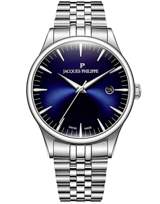 Jacques Philippe JPQGS661336 — стильные мужские часы в классическом формате с акцентом на надёжность и элегантность. Корпус круглой формы диаметром 40 мм из нержавеющей стали отличается утонченным силуэтом при толщине примерно 12 мм, обеспечивая комфорт при длительном ношении . Циферблат оформлен лаконично: тонкие стрелки и минималистичные часовые метки с люминесцентным покрытиемЛюминесцентное покрытиеПозволяет считывать показания времени в темноте. Производители наносят на стрелки, часовые индексы, безель или поверхность циферблата светонакопительный состав, дающий холодное свечение. подчёркивают строгий характер модели. Встроенная функция отображения даты придаёт часам практичность без лишнего визуального нагромождения. Поверхность защищает сапфировое стеклоСапфировое стеклоПрочный и надёжный материал из кристалла сапфира синтетического происхождения, характеризующийся особой твёрдостью и устойчивостью к царапинам и повреждениям. — устойчивое к царапинам и бликам. Внутри используется точный швейцарский кварцевый механизм, не требующий подзавода и сохраняющий стабильную работу без сложного обслуживания. Модель оснащена металлическим браслетом из нержавеющей стали в оттенке металлик‑серый на застёжке-бабочке с кнопкамиЗастёжка "бабочка"Такой вид застёжки дополняется предохранителями, помогающими избежать случайного раскрытия браслета. Обладают изящным исполнением. , ширина звеньев около 22 мм, что обеспечивает надёжную посадку и солидный внешний вид . Водозащита составляет до 5 ATM, — часы без проблем выдерживают случайный контакт с водой в повседневной эксплуатации . Jacques Philippe — гармоничное сочетание классического стиля, точного швейцарского кварца и практичности в одном надёжном аксессуаре.