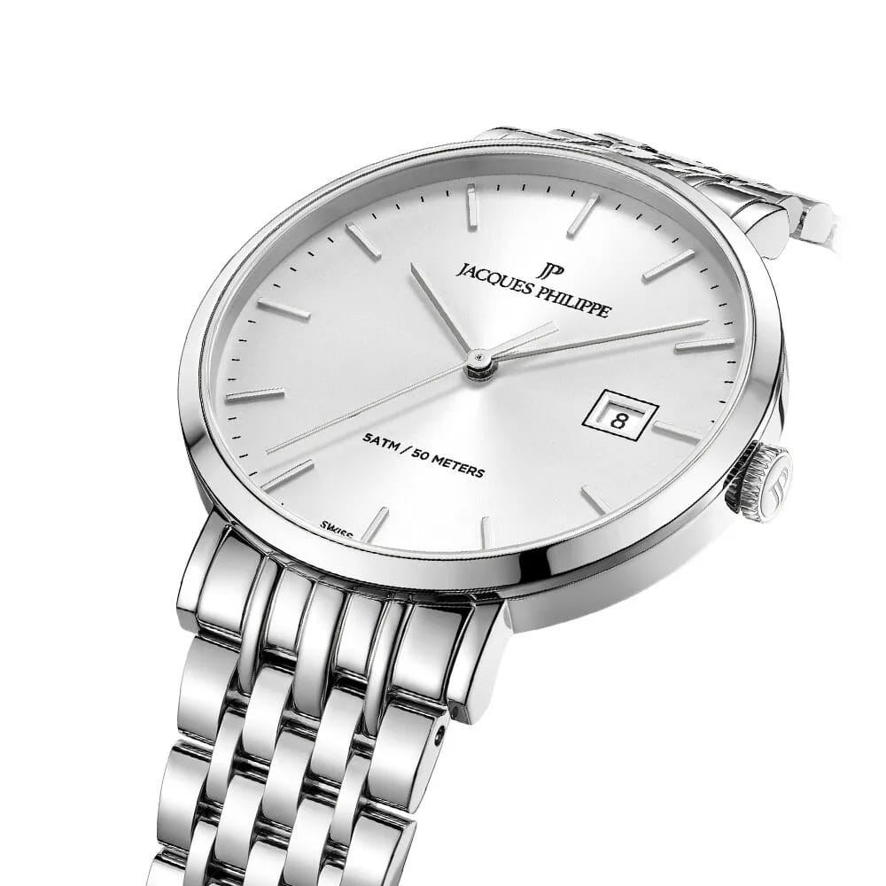Швейцарские мужские часы Jacques Philippe Albunea JPQGS951326 кварцевый механизм с высокой точностью. Прочное сапфировое стеклоСапфировое стеклоПрочный и надёжный материал из кристалла сапфира синтетического происхождения, характеризующийся особой твёрдостью и устойчивостью к царапинам и повреждениям. устойчивое к царапинам и механическим повреждениям. Циферблат серебристого цвета украшен классическими стрелками и метками гармонично дополняющие общий дизайн модели. Элегантный корпус изготовлен из нержавеющей стали, диаметром 39 мм, что делает их устойчивыми к внешним воздействиям и придает благородный вид. Стальной браслет на застёжке-бабочке с кнопкамиЗастёжка "бабочка"Такой вид застёжки дополняется предохранителями, помогающими избежать случайного раскрытия браслета. Обладают изящным исполнением. обеспечивает комфортное и безопасное ношение. Окошко даты находится в положении 3 часа. Класс водозащиты: 50 метров позволит защитить корпус от случайных брызг или капель дождя. Эти часы станут идеальным выбором для мужчин, ценящих стиль, качество и функциональность.