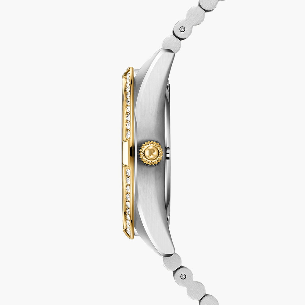 Jacques Philippe Radiante JPQLS687388YG — изящная женская модель коллекции Radiante с кварцевым механизмом, сочетающая классический стиль и практичность. Корпус диаметром 33 мм выполнен из нержавеющей стали и полированными поверхностями, безельБезельВнешний ободок, закрепляющий стекло. В спортивных часах так называется поворотное кольцо с делениями на циферблате, выполняет роль таймера – замеряет отрезки времени на шкале. Неподвижный безель – элемент декора. Однонаправленно вращающийся безель на дайверских часах позволяет фиксировать моменты погружения и выныривания на поверхность. с PVDPVDУльтратонкое покрытие наносится в технике вакуумного напыления, сочетает в себе нитрид титана особой прочности со слоем золота или оксида хрома. Несёт в себе декоративную или защитную функцию. инкрустирован кристаллами, что придаёт часам утончённый блеск. Водозащита до 5 атм (50 м) позволяет носить модель в повседневных условиях. Выпуклое сапфировое стеклоСапфировое стеклоПрочный и надёжный материал из кристалла сапфира синтетического происхождения, характеризующийся особой твёрдостью и устойчивостью к царапинам и повреждениям. обеспечивает защиту от царапин и сохраняет высокую прозрачность, делая циферблат легко читаемым. Модель оснащена точным швейцарским кварцевым механизмом с индикацией часов, минут и секунд. Циферблат оформлен в лаконичном стиле с аккуратными метками, а браслет из нержавеющей стали с частичным PVDPVDУльтратонкое покрытие наносится в технике вакуумного напыления, сочетает в себе нитрид титана особой прочности со слоем золота или оксида хрома. Несёт в себе декоративную или защитную функцию.-покрытием гармонично завершает образ, подчёркивая универсальность и элегантность этих часов.