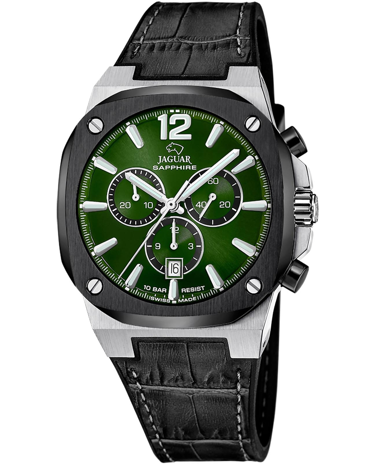 Мужские швейцарские часы Jaguar Rond Carre J1026/5 — это стильное сочетание элегантности и современного дизайна. Корпус из нержавеющей стали диаметром 43 мм идеально сбалансирован и элегантен. Сапфировое стеклоСапфировое стеклоПрочный и надёжный материал из кристалла сапфира синтетического происхождения, характеризующийся особой твёрдостью и устойчивостью к царапинам и повреждениям. с антибликовым покрытием защищает циферблат от царапин и обеспечивает отличную читаемость при любом освещении. Кожаный ремешок на застёжке-бабочке с кнопкамиЗастёжка "бабочка"Такой вид застёжки дополняется предохранителями, помогающими избежать случайного раскрытия браслета. Обладают изящным исполнением. идеально дополняют дизайн часов, обеспечивая комфортное ношение. Стрелки и метки на циферблате имеют люминесцентное покрытиеЛюминесцентное покрытиеПозволяет считывать показания времени в темноте. Производители наносят на стрелки, часовые индексы, безель или поверхность циферблата светонакопительный состав, дающий холодное свечение. позволяющее легко определять время даже в темноте. БезельБезельВнешний ободок, закрепляющий стекло. В спортивных часах так называется поворотное кольцо с делениями на циферблате, выполняет роль таймера – замеряет отрезки времени на шкале. Неподвижный безель – элемент декора. Однонаправленно вращающийся безель на дайверских часах позволяет фиксировать моменты погружения и выныривания на поверхность. с PVD-покрытиемPVDУльтратонкое покрытие наносится в технике вакуумного напыления, сочетает в себе нитрид титана особой прочности со слоем золота или оксида хрома. Несёт в себе декоративную или защитную функцию. черного цвета. Часы обладают впечатляющей водонепроницаемостью до 10 бар (100 метров), что делает их идеальными для плавания, ныряния и погружений с аквалангом. В часах есть функция хронографаХронографФункция позволяет измерять отрезки времени с особой точностью: часы, минуты, секунды. Верным признаком хронографа является наличие на циферблате 3 дополнительных окошек-счётчиков., с помощью которой вы сможете измерять время с высокой точностью.