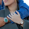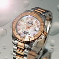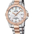 Женские швейцарские часы Jaguar Couple Diver J871/5. Кварцевый швейцарский калибр Ronda 705. Сапфировое стеклоСапфировое стеклоПрочный и надёжный материал из кристалла сапфира синтетического происхождения, характеризующийся особой твёрдостью и устойчивостью к царапинам и повреждениям. устойчивое к мелким механическим повреждениям. Корпус часов изготовлен из нержавеющей стали. Стрелки и метки с люминесцентным покрытиемЛюминесцентное покрытиеПозволяет считывать показания времени в темноте. Производители наносят на стрелки, часовые индексы, безель или поверхность циферблата светонакопительный состав, дающий холодное свечение.. Окошко даты находится в положении 3 часа. Класс водозащиты: 200 метров, позволит плавать, нырять и заниматься другими водными видами спорта. Стальной браслет с частичным PVD-покрытиемPVDУльтратонкое покрытие наносится в технике вакуумного напыления, сочетает в себе нитрид титана особой прочности со слоем золота или оксида хрома. Несёт в себе декоративную или защитную функцию. на раскладной застёжкеРаскладная застёжкаТакой тип застёжки используется только на браслетах из металла. Она никогда не раскрывается полностью, происходит разделение на 2 и более частей. Раскладывающая застёжка снизит вероятность потери часов к минимуму.. Циферблат украшен 11 кристаллами в роли часовых индексов. БезельБезельВнешний ободок, закрепляющий стекло. В спортивных часах так называется поворотное кольцо с делениями на циферблате, выполняет роль таймера – замеряет отрезки времени на шкале. Неподвижный безель – элемент декора. Однонаправленно вращающийся безель на дайверских часах позволяет фиксировать моменты погружения и выныривания на поверхность. с PVD-покрытиемPVDУльтратонкое покрытие наносится в технике вакуумного напыления, сочетает в себе нитрид титана особой прочности со слоем золота или оксида хрома. Несёт в себе декоративную или защитную функцию..