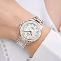 Женские швейцарские часы Jaguar Woman J892/1. Кварцевый швейцарский калибр Ronda 705. Сапфировое стеклоСапфировое стеклоПрочный и надёжный материал из кристалла сапфира синтетического происхождения, характеризующийся особой твёрдостью и устойчивостью к царапинам и повреждениям. устойчивое к мелким механическим повреждениям. Корпус и браслет часов изготовлены из нержавеющей стали, с безелем, инкрустированным цирконием. Стрелки с люминесцентным покрытиемЛюминесцентное покрытиеПозволяет считывать показания времени в темноте. Производители наносят на стрелки, часовые индексы, безель или поверхность циферблата светонакопительный состав, дающий холодное свечение.. Окошко даты находится в положении 3 часа. Класс водозащиты: 200 метров, позволит плавать, нырять и заниматься другими водными видами спорта. Стальной браслет на раскладной застёжкеРаскладная застёжкаТакой тип застёжки используется только на браслетах из металла. Она никогда не раскрывается полностью, происходит разделение на 2 и более частей. Раскладывающая застёжка снизит вероятность потери часов к минимуму.. Циферблат украшен кристаллами в роли часовых индексов.