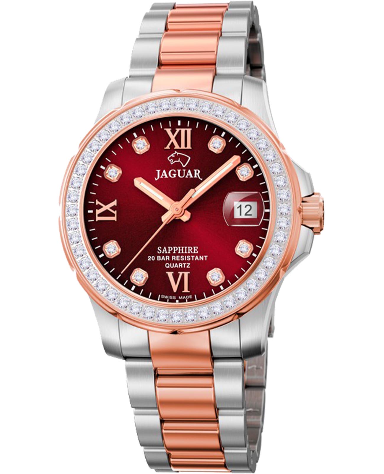 Женские швейцарские часы Jaguar Woman J894/3. Кварцевый швейцарский калибр Ronda 705. Сапфировое стеклоСапфировое стеклоПрочный и надёжный материал из кристалла сапфира синтетического происхождения, характеризующийся особой твёрдостью и устойчивостью к царапинам и повреждениям. устойчивое к мелким механическим повреждениям. Корпус и браслет часов изготовлены из нержавеющей стали, с безелем, инкрустированным цирконием. Стрелки с люминесцентным покрытиемЛюминесцентное покрытиеПозволяет считывать показания времени в темноте. Производители наносят на стрелки, часовые индексы, безель или поверхность циферблата светонакопительный состав, дающий холодное свечение.. Окошко даты находится в положении 3 часа. Класс водозащиты: 200 метров, позволит плавать, нырять и заниматься другими водными видами спорта. Стальной браслет с частичным PVD-покрытиемPVDУльтратонкое покрытие наносится в технике вакуумного напыления, сочетает в себе нитрид титана особой прочности со слоем золота или оксида хрома. Несёт в себе декоративную или защитную функцию. на раскладной застёжкеРаскладная застёжкаТакой тип застёжки используется только на браслетах из металла. Она никогда не раскрывается полностью, происходит разделение на 2 и более частей. Раскладывающая застёжка снизит вероятность потери часов к минимуму.. Циферблат украшен кристаллами в роли часовых индексов. БезельБезельВнешний ободок, закрепляющий стекло. В спортивных часах так называется поворотное кольцо с делениями на циферблате, выполняет роль таймера – замеряет отрезки времени на шкале. Неподвижный безель – элемент декора. Однонаправленно вращающийся безель на дайверских часах позволяет фиксировать моменты погружения и выныривания на поверхность. с PVD-покрытиемPVDУльтратонкое покрытие наносится в технике вакуумного напыления, сочетает в себе нитрид титана особой прочности со слоем золота или оксида хрома. Несёт в себе декоративную или защитную функцию. инкрустирован кристаллами.