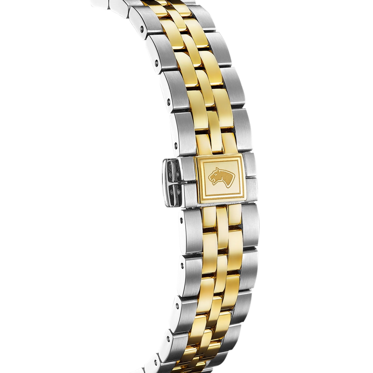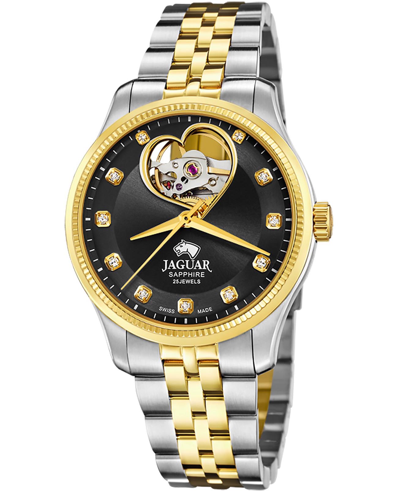 Женские швейцарские часы Jaguar Automatic Open Heart J995/2, механизм — автоподзавод. В часах с автоподзаводом заводная головка практически не используется, что исключает истирание ее материала и материала корпуса. Сапфировое стеклоСапфировое стеклоПрочный и надёжный материал из кристалла сапфира синтетического происхождения, характеризующийся особой твёрдостью и устойчивостью к царапинам и повреждениям. устойчивое к мелким механическим повреждениям. Корпус часов изготовлен из нержавеющей стали. Класс водозащиты: 50 метров, позволит защитить корпус от случайных брызг или капель дождя. Стальной браслет с частичным PVD-покрытиемPVDУльтратонкое покрытие наносится в технике вакуумного напыления, сочетает в себе нитрид титана особой прочности со слоем золота или оксида хрома. Несёт в себе декоративную или защитную функцию. на застёжке-бабочке с кнопкамиЗастёжка "бабочка"Такой вид застёжки дополняется предохранителями, помогающими избежать случайного раскрытия браслета. Обладают изящным исполнением. . Циферблат украшен кристаллами в роли часовых индексов, крупная апертура в виде сердца, открывающая обзор на балансовое колесо механизма. БезельБезельВнешний ободок, закрепляющий стекло. В спортивных часах так называется поворотное кольцо с делениями на циферблате, выполняет роль таймера – замеряет отрезки времени на шкале. Неподвижный безель – элемент декора. Однонаправленно вращающийся безель на дайверских часах позволяет фиксировать моменты погружения и выныривания на поверхность. с PVD-покрытиемPVDУльтратонкое покрытие наносится в технике вакуумного напыления, сочетает в себе нитрид титана особой прочности со слоем золота или оксида хрома. Несёт в себе декоративную или защитную функцию..