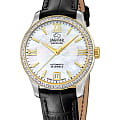 Женские швейцарские часы Jaguar Automatic Woman J998/A, механизм — автоподзавод. В часах с автоподзаводом заводная головка практически не используется, что исключает истирание ее материала и материала корпуса. Сапфировое стеклоСапфировое стеклоПрочный и надёжный материал из кристалла сапфира синтетического происхождения, характеризующийся особой твёрдостью и устойчивостью к царапинам и повреждениям. устойчивое к мелким механическим повреждениям. Корпус и браслет часов изготовлены из нержавеющей стали. Окошко даты находится в положении 6 часов. Класс водозащиты: 50 метров, позволит защитить корпус от случайных брызг или капель дождя. Кожаный ремешок на застёжке-бабочке с кнопкамиЗастёжка "бабочка"Такой вид застёжки дополняется предохранителями, помогающими избежать случайного раскрытия браслета. Обладают изящным исполнением. . БезельБезельВнешний ободок, закрепляющий стекло. В спортивных часах так называется поворотное кольцо с делениями на циферблате, выполняет роль таймера – замеряет отрезки времени на шкале. Неподвижный безель – элемент декора. Однонаправленно вращающийся безель на дайверских часах позволяет фиксировать моменты погружения и выныривания на поверхность. с PVD-покрытиемPVDУльтратонкое покрытие наносится в технике вакуумного напыления, сочетает в себе нитрид титана особой прочности со слоем золота или оксида хрома. Несёт в себе декоративную или защитную функцию. инкрустирован цирконием.