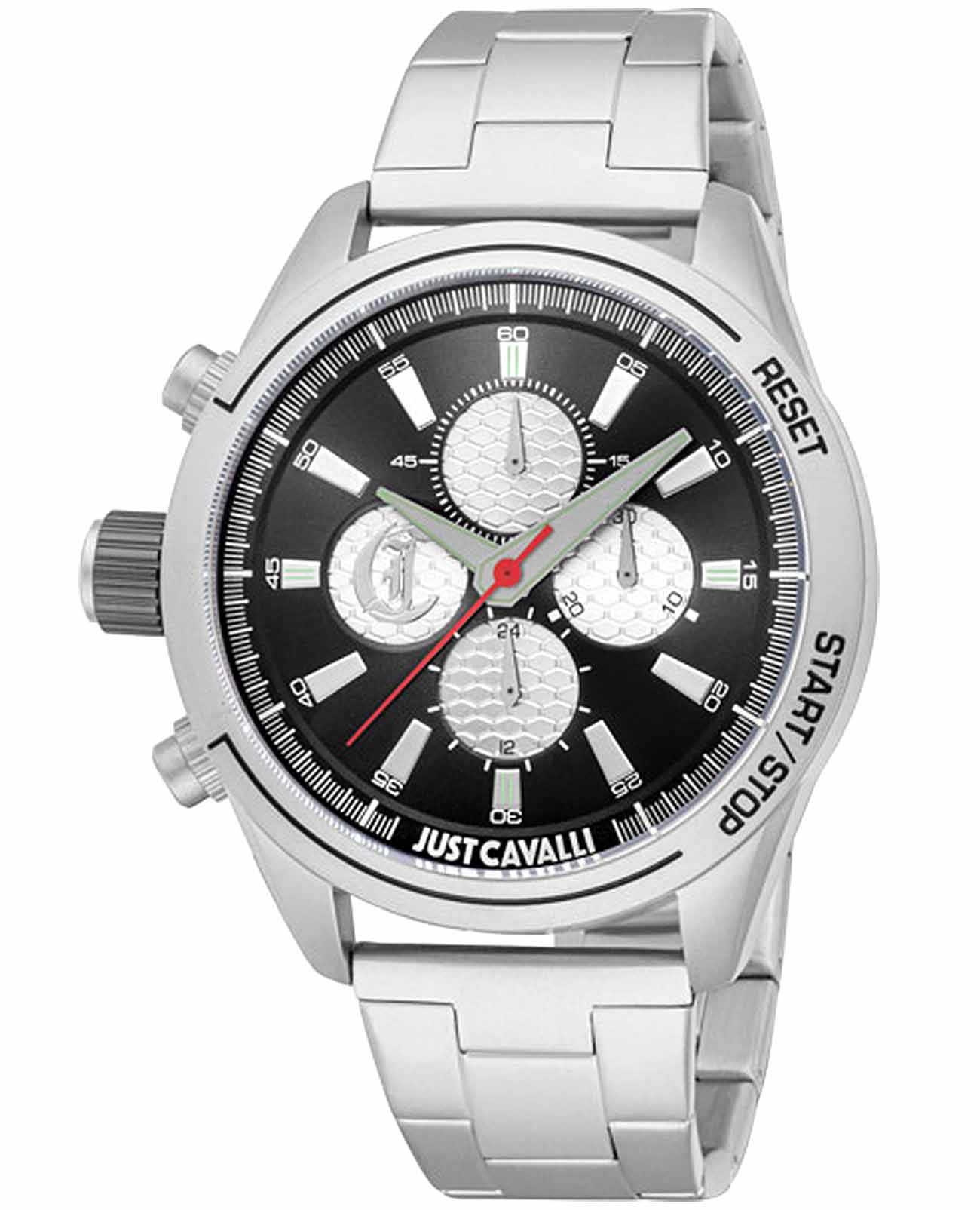 JUST CAVALLI JC1G347M0065 — стильные итальянские часы с функцией хронографаХронографФункция позволяет измерять отрезки времени с особой точностью: часы, минуты, секунды. Верным признаком хронографа является наличие на циферблате 3 дополнительных окошек-счётчиков., которые сочетают в себе элегантность и современный функционал. Круглый корпус диаметром 45 мм выполнен из нержавеющей стали, толщина корпуса составляет 12 мм, что придает модели выразительный внешний вид и надежную защиту от внешних воздействий. Часы оснащены кварцевым механизмом. Минеральное стеклоМинеральное стеклоМинеральное стекло представляет собой искусственно выращенный минерал кварца. Такое стекло отличается особой устойчивостью к повреждениям и царапинам. Уступает по некоторым качествам сапфировому стеклу. защищает часы от царапин, а водозащита 100 метров позволяет не снимать их во время плавания и занятий спортом. Стальной браслет на раскладной застёжкеРаскладная застёжкаТакой тип застёжки используется только на браслетах из металла. Она никогда не раскрывается полностью, происходит разделение на 2 и более частей. Раскладывающая застёжка снизит вероятность потери часов к минимуму. обеспечивает комфортное ношение. Эта модель — идеальный выбор для тех, кто ценит современные технологии , классический стиль и качество.