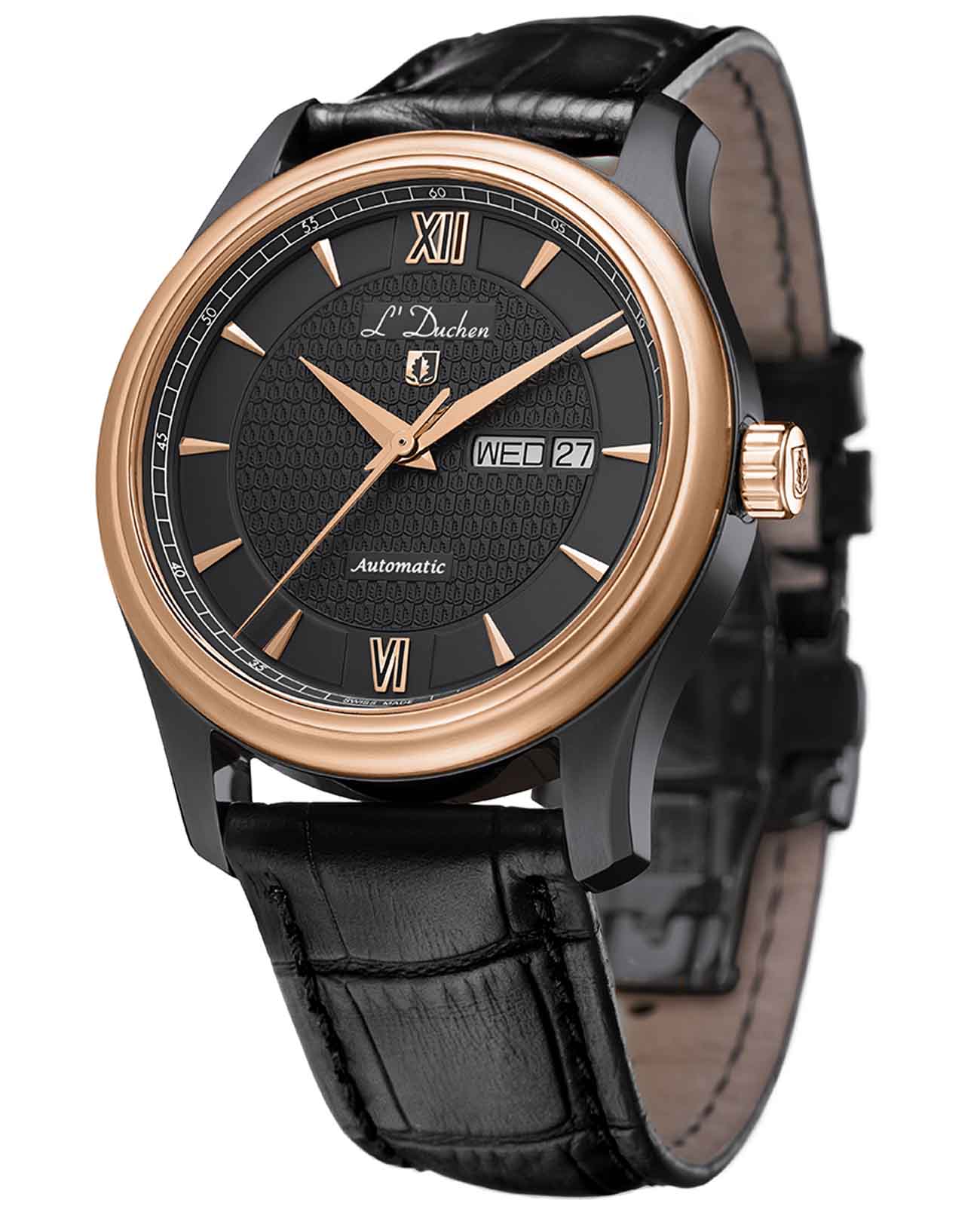 Мужские механические швейцарские часы с автоподзаводом L'Duchen Tradition D 253.91.21. Сапфировое стеклоСапфировое стеклоПрочный и надёжный материал из кристалла сапфира синтетического происхождения, характеризующийся особой твёрдостью и устойчивостью к царапинам и повреждениям. устойчивое к появлению царапин, обладающее высокой прозрачностью. Корпус часов выполнен из нержавеющей стали с PVD-покрытиемPVDУльтратонкое покрытие наносится в технике вакуумного напыления, сочетает в себе нитрид титана особой прочности со слоем золота или оксида хрома. Несёт в себе декоративную или защитную функцию.. Класс водозащиты: 50 метров, позволит защитить корпус от случайных брызг или капель дождя. Кожаный ремешок на застёжке «бабочка» с кнопкамиЗастёжка "бабочка"Такой вид застёжки дополняется предохранителями, помогающими избежать случайного раскрытия браслета. Обладают изящным исполнением. .