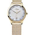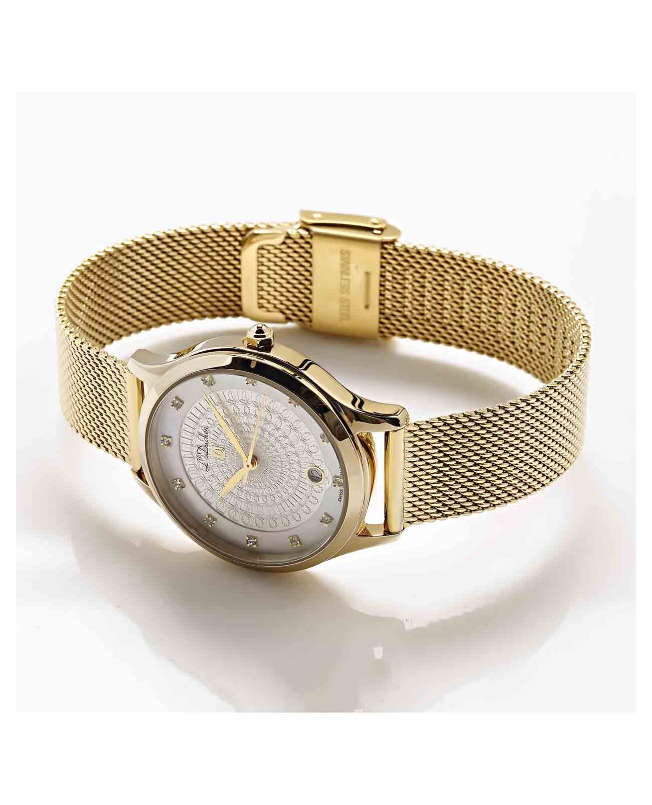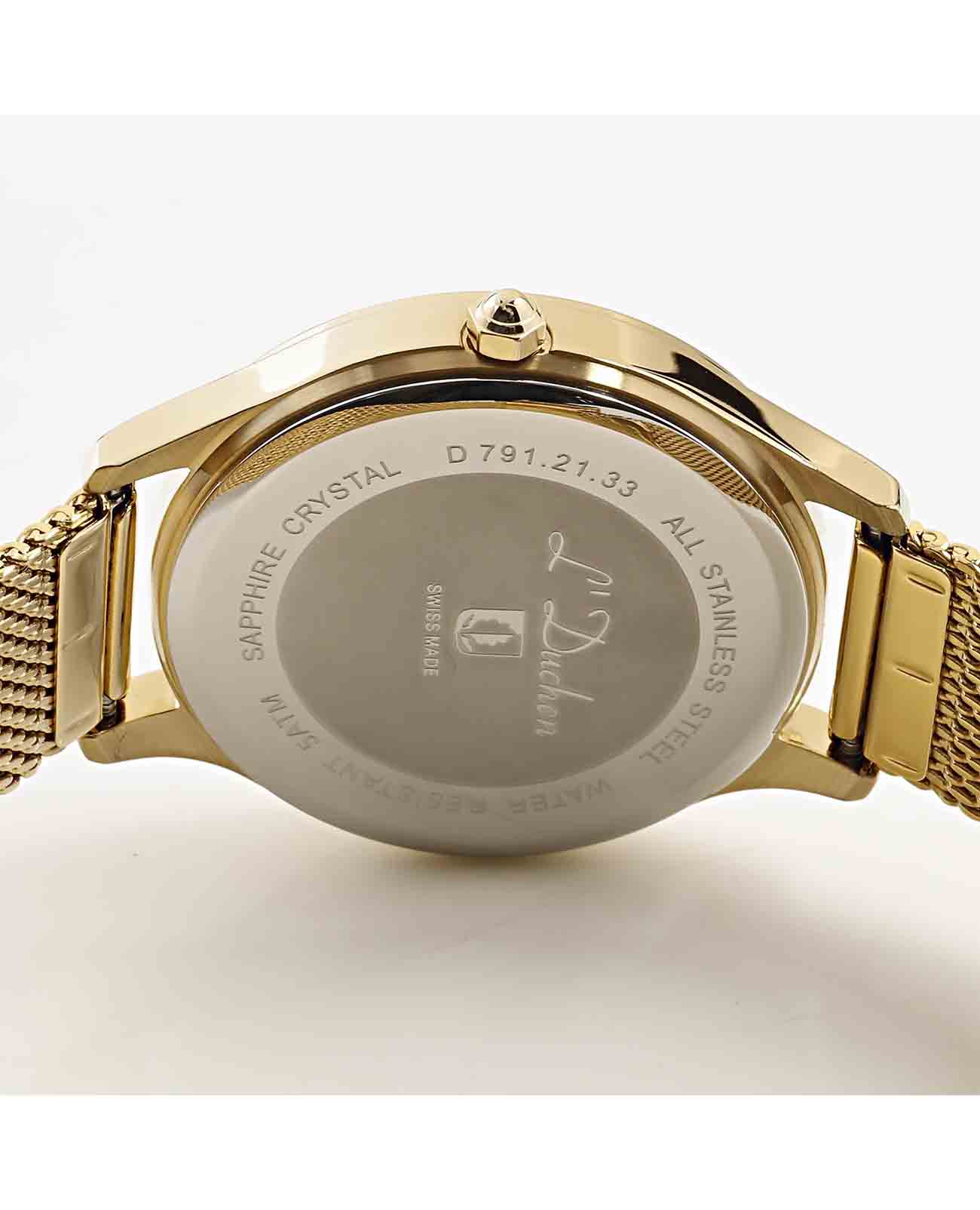 Женские швейцарские часы L'Duchen Grace D 791.21.33 M, кварцевый механизм с высокой точностью. Сапфировое стеклоСапфировое стеклоПрочный и надёжный материал из кристалла сапфира синтетического происхождения, характеризующийся особой твёрдостью и устойчивостью к царапинам и повреждениям. устойчивое к появлению царапин, обладающее высокой прозрачностью. Корпус часов выполнен из нержавеющей стали с PVD-покрытиемPVDУльтратонкое покрытие наносится в технике вакуумного напыления, сочетает в себе нитрид титана особой прочности со слоем золота или оксида хрома. Несёт в себе декоративную или защитную функцию.. Окошко даты находится в положении 6 часов. Класс водозащиты: 50 метров, позволит защитить корпус от случайных брызг или капель дождя. Стальной браслет миланского плетения с PVD-покрытиемPVDУльтратонкое покрытие наносится в технике вакуумного напыления, сочетает в себе нитрид титана особой прочности со слоем золота или оксида хрома. Несёт в себе декоративную или защитную функцию. на раскладном замкеРаскладной замокДанный вариант застежки используется только на часах с металлическим браслетом. Отличительная особенность такого крепления в том, что длина браслета становится универсальной и вы можете самостоятельно отрегулировать нужный вам размер – застежка просто двигается по браслету часов..