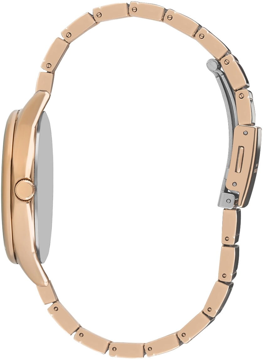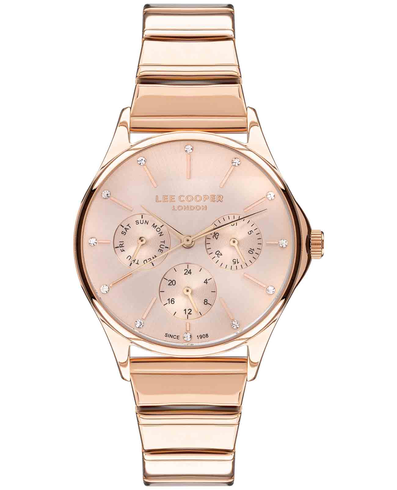 Женские наручные часы Lee Cooper LC07482.410 — это элегантная модель с утончённым дизайном. Корпус диаметром 36 мм выполнен из суперметалла с IP-покрытиемIP-покрытиеМетод ионного напыления. Демонстрирует повышенную устойчивость к истиранию, окислению и химическим веществам. Под воздействием высокого давления и температуры около 1500°C молекулы металла надёжно соединяются с частицами корпуса часов., что придаёт часам изысканный вид. Золотистый циферблат украшен изящными метками с кристаллами и стрелками, обеспечивая удобное считывание времени. Циферблат защищён минеральным стекломМинеральное стеклоМинеральное стекло представляет собой искусственно выращенный минерал кварца. Такое стекло отличается особой устойчивостью к повреждениям и царапинам. Уступает по некоторым качествам сапфировому стеклу., устойчивым к царапинам. Часы работают на кварцевом механизме, обеспечивая точность хода. Браслет из нержавеющей стали с раскладной застёжкойРаскладная застёжкаТакой тип застёжки используется только на браслетах из металла. Она никогда не раскрывается полностью, происходит разделение на 2 и более частей. Раскладывающая застёжка снизит вероятность потери часов к минимуму. гарантирует комфортное ношение и надёжную фиксацию на запястье. Водозащита 30 метров защищает часы от случайных брызг и дождя, делая их подходящими для повседневного использования. Имеют встроенный календарь с отображением даты, дня недели и 24-часового формата, что делает их идеальными для организации вашего дня.