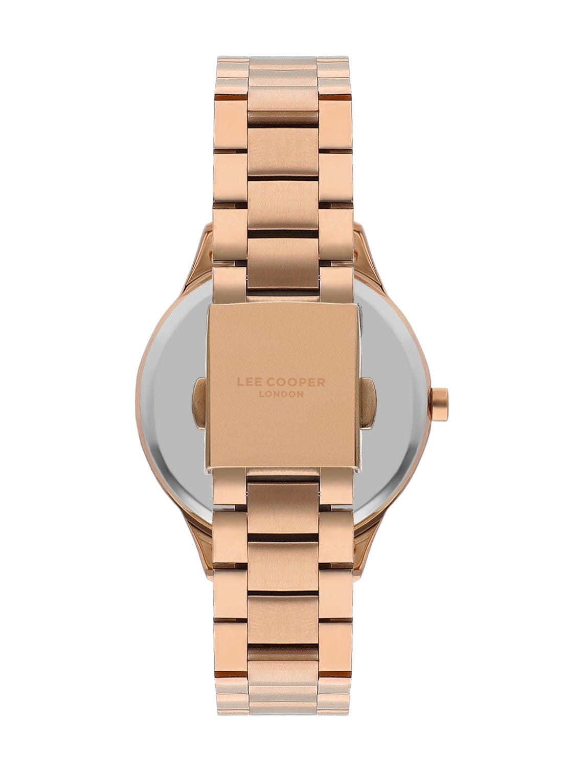 Женские часы Lee Cooper LC07865.430 — это стильное сочетание элегантности и современного дизайна. Круглый корпус диаметром 38 мм выполнен из суперметалла с IP-покрытиемIP-покрытиеМетод ионного напыления. Демонстрирует повышенную устойчивость к истиранию, окислению и химическим веществам. Под воздействием высокого давления и температуры около 1500°C молекулы металла надёжно соединяются с частицами корпуса часов. цвета розового золота, придающий модели особый блеск. Серебристый циферблат защищен минеральным стекломМинеральное стеклоМинеральное стекло представляет собой искусственно выращенный минерал кварца. Такое стекло отличается особой устойчивостью к повреждениям и царапинам. Уступает по некоторым качествам сапфировому стеклу., обеспечивающим устойчивость к царапинам. Часы оснащены надежным кварцевым механизмом, а стальной браслет с IP-покрытиемIP-покрытиеМетод ионного напыления. Демонстрирует повышенную устойчивость к истиранию, окислению и химическим веществам. Под воздействием высокого давления и температуры около 1500°C молекулы металла надёжно соединяются с частицами корпуса часов. на раскладной застёжкеРаскладная застёжкаТакой тип застёжки используется только на браслетах из металла. Она никогда не раскрывается полностью, происходит разделение на 2 и более частей. Раскладывающая застёжка снизит вероятность потери часов к минимуму. гарантирует комфортную посадку на запястье. Мультифункциональная модель с индикацией даты, дня недели, с дополнительным 24-х часовым индикатором. Водозащита 30 метров защищает модель от случайных брызг и дождя. Lee Cooper — отличный выбор для тех, кто ценит утонченность и качество.