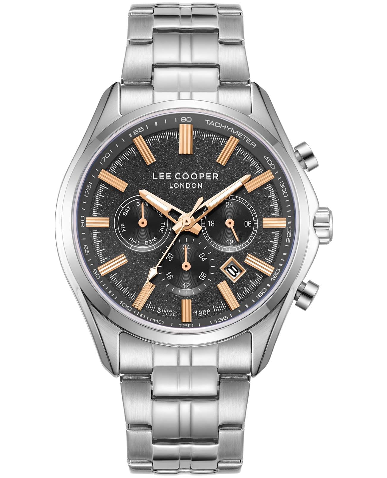 Мужские наручные часы Lee Cooper LC08199.360 оснащены кварцевым механизмом, обеспечивающий высокую точность хода и надежность. Элегантный корпус часов выполнен из суперметалла серебристого цвета, что делает их устойчивыми к внешним воздействиям и придает благородный вид. Циферблат украшен классическими стрелками с люминесцентным покрытиемЛюминесцентное покрытиеПозволяет считывать показания времени в темноте. Производители наносят на стрелки, часовые индексы, безель или поверхность циферблата светонакопительный состав, дающий холодное свечение., гармонично дополняющим общий дизайн модели. Для защиты циферблата используется минеральное стеклоМинеральное стеклоМинеральное стекло представляет собой искусственно выращенный минерал кварца. Такое стекло отличается особой устойчивостью к повреждениям и царапинам. Уступает по некоторым качествам сапфировому стеклу., устойчивое к царапинам и механическим повреждениям, тахиметрТахиметрРазмеченная шкала, располагается на ободке или безеле часов. Тахиметр позволяет рассчитать скорость на определённом участке пути, расстояние измеряется в километрах или милях. по внешнему краю. Корпус имеет круглую форму диаметром 44 мм, что делает часы заметными и подходящими. Браслет из стали оснащен раскладной застёжкойРаскладная застёжкаТакой тип застёжки используется только на браслетах из металла. Она никогда не раскрывается полностью, происходит разделение на 2 и более частей. Раскладывающая застёжка снизит вероятность потери часов к минимуму., обеспечивающим комфортное и безопасное ношение. Вынесенный циферблат с 24-х часовым указателем времени, индикацией даты и дня недели. Окошко даты находится в положении между 4 и 5 часов. Часы обладают водонепроницаемостью до 30 метров (3 АТМ), что позволяет использовать их в повседневной жизни, включая контакт с водой при мытье рук или дожде. Эти часы станут идеальным выбором для мужчин, ценящих стиль, качество и функциональность.