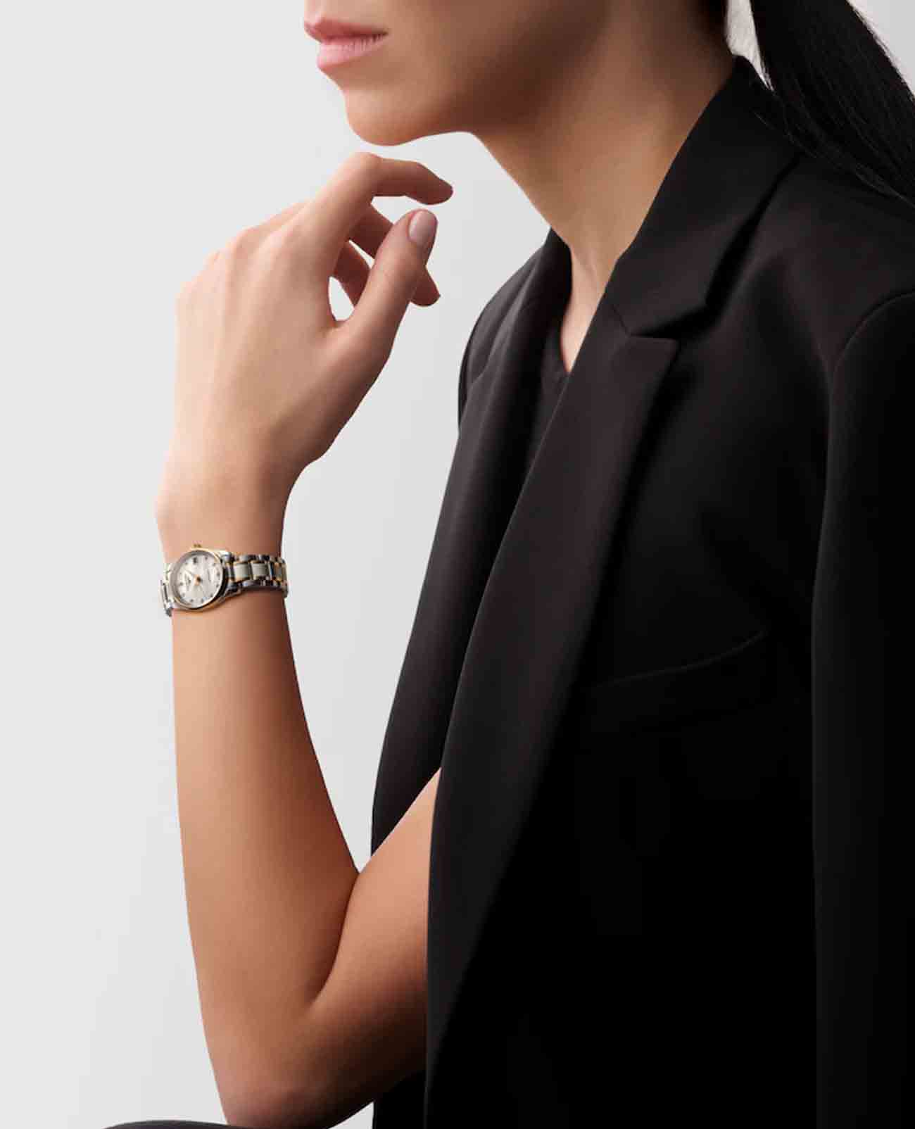 Корпус часов выполнен из комбинации нержавеющей стали и 18-каратного золота18-каратное золотоОбозначение по каратной системе пробирования, оно показывает, сколько драгоценного металла содержится в изделии. 18 карат - в составе 75% чистого золота, соответствует 750 пробе.