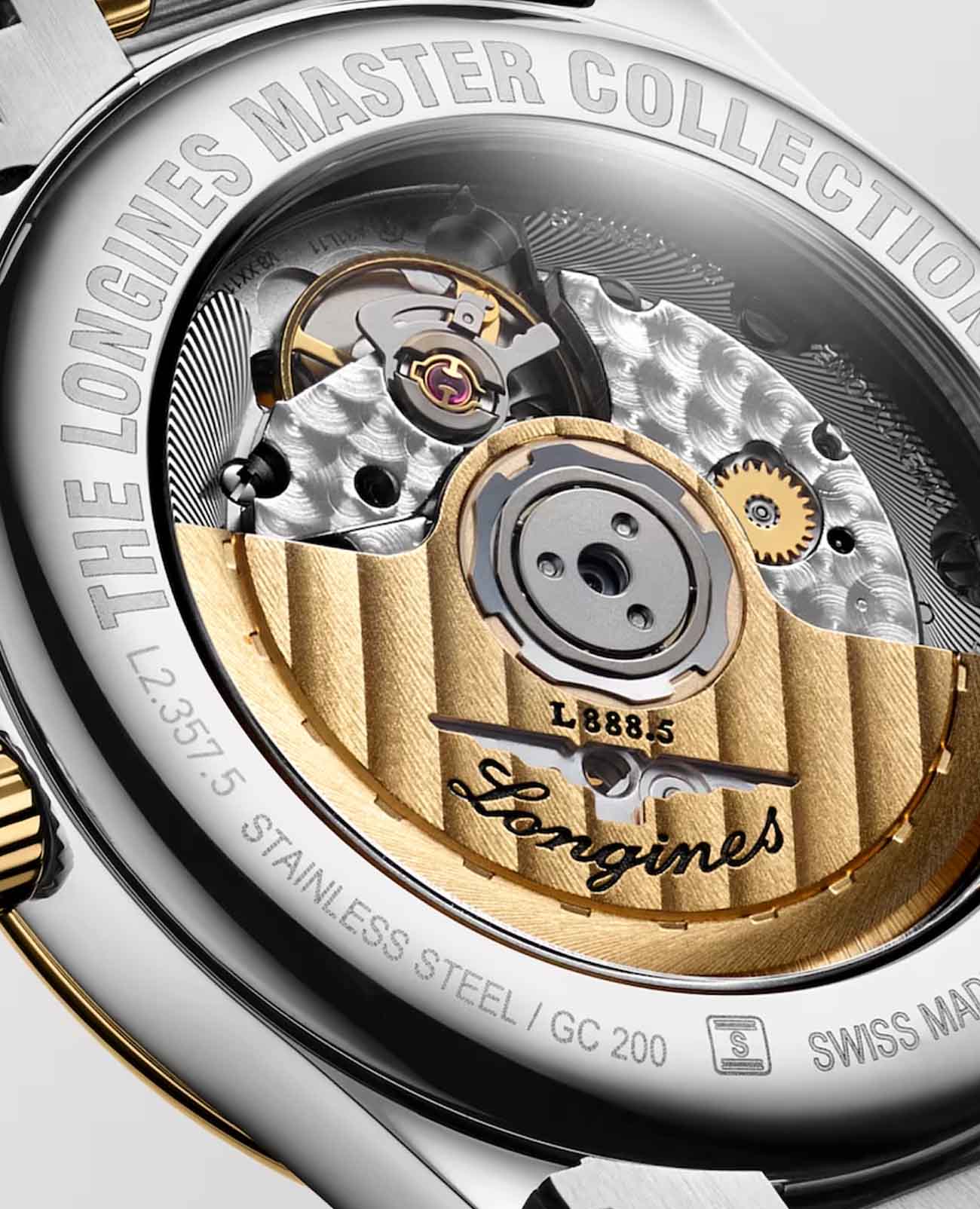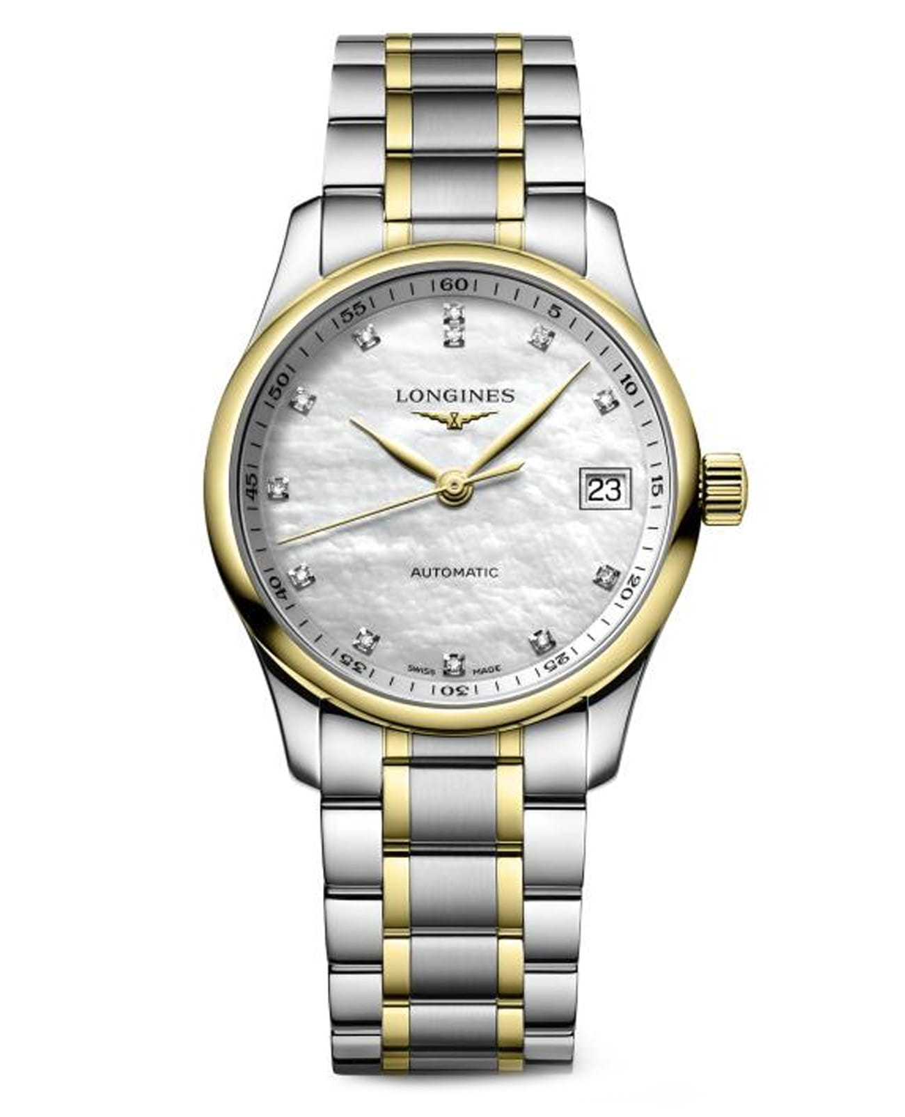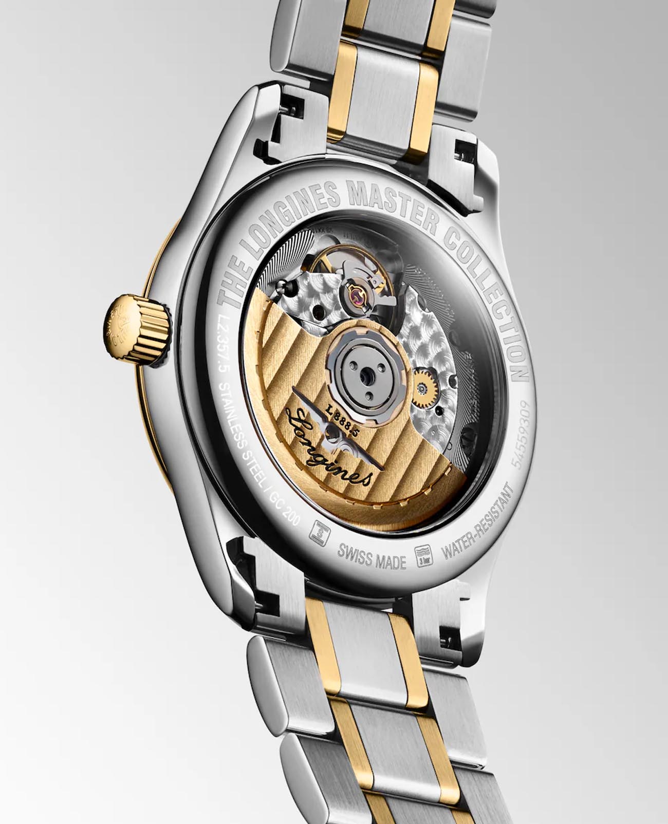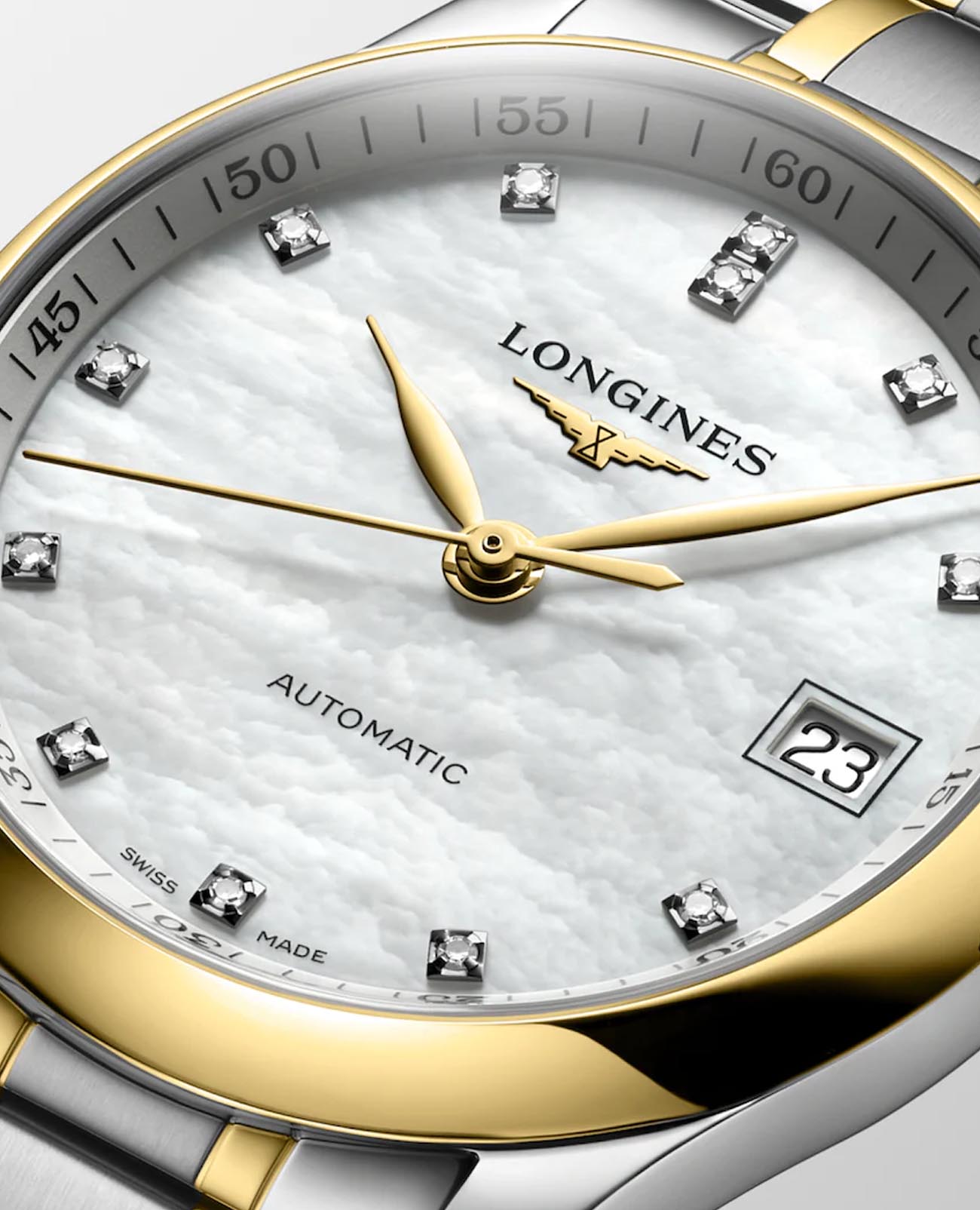 Женские швейцарские механические часы с автоподзаводом Longines Master Collection L2.357.5.87.7. Сапфировое стеклоСапфировое стеклоПрочный и надёжный материал из кристалла сапфира синтетического происхождения, характеризующийся особой твёрдостью и устойчивостью к царапинам и повреждениям. устойчивое к появлению царапин, обладающее высокой прозрачностью. Корпус часов изготовлен из нержавеющей стали. БезельБезельВнешний ободок, закрепляющий стекло. В спортивных часах так называется поворотное кольцо с делениями на циферблате, выполняет роль таймера – замеряет отрезки времени на шкале. Неподвижный безель – элемент декора. Однонаправленно вращающийся безель на дайверских часах позволяет фиксировать моменты погружения и выныривания на поверхность. с 18-каратным золотом18-каратное золотоОбозначение по каратной системе пробирования, оно показывает, сколько драгоценного металла содержится в изделии. 18 карат - в составе 75% чистого золота, соответствует 750 пробе.