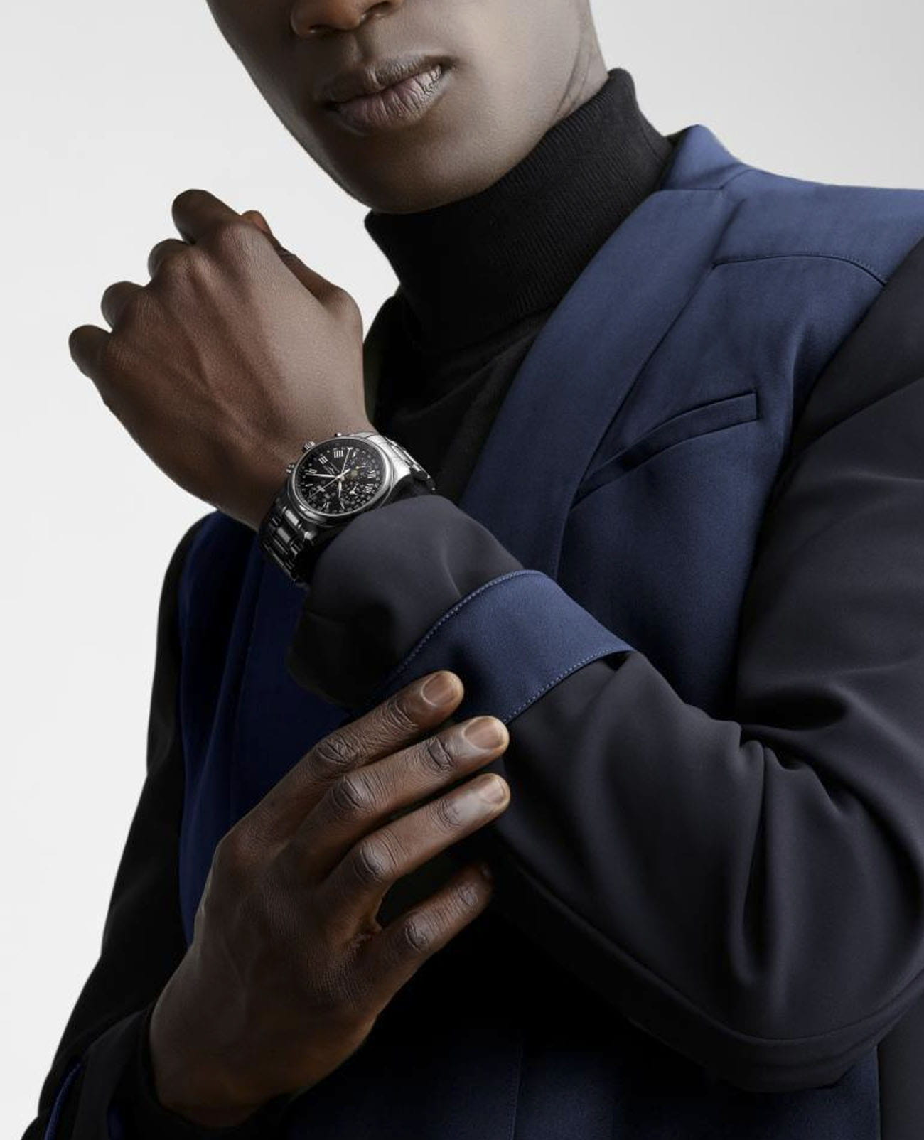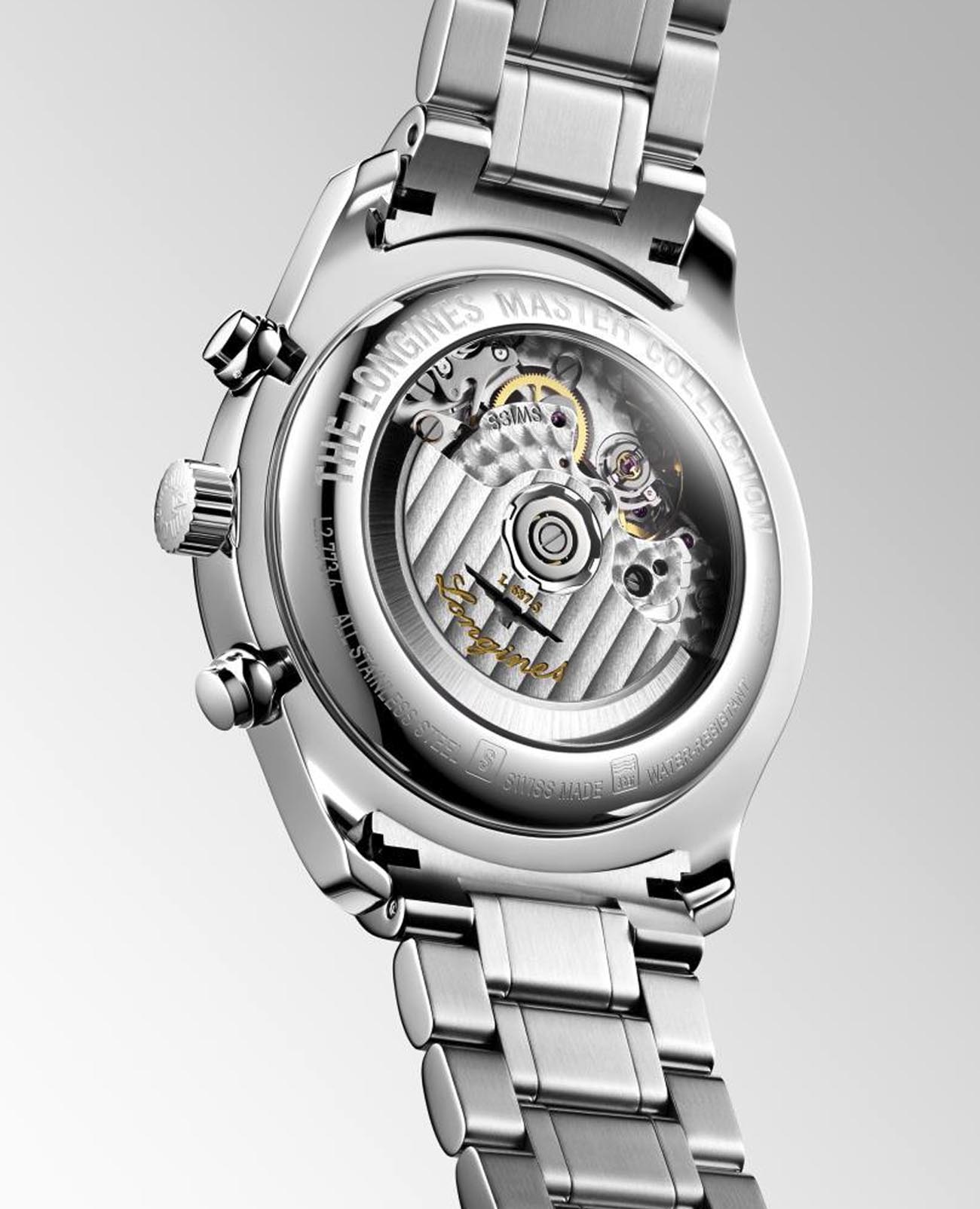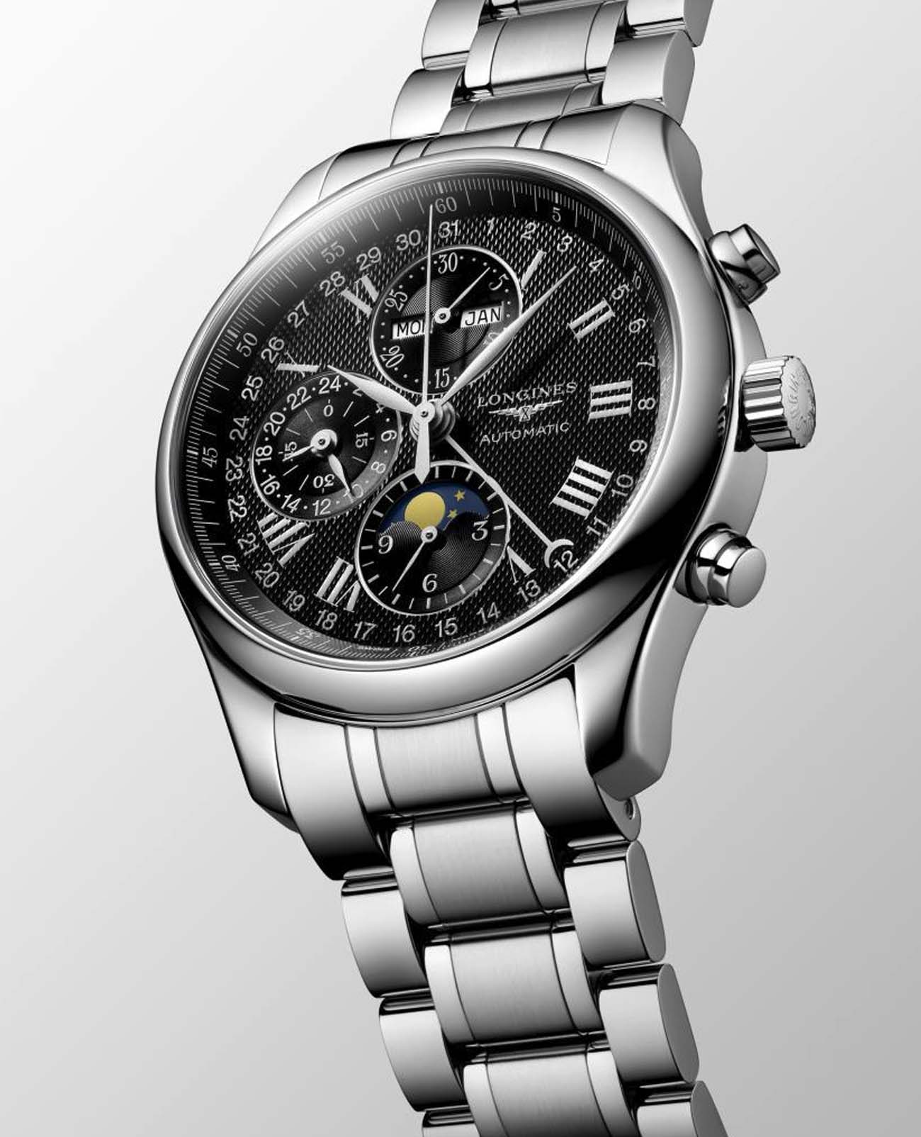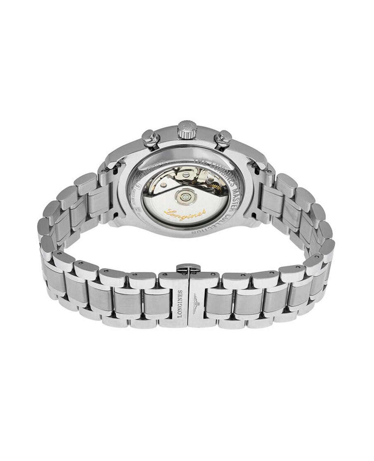 Мужсике швейцарские механические часы-хронографХронографФункция позволяет измерять отрезки времени с особой точностью: часы, минуты, секунды. Верным признаком хронографа является наличие на циферблате 3 дополнительных окошек-счётчиков. с автоподзаводом Longines Master Collection L2.773.4.51.6. Сапфировое стеклоСапфировое стеклоПрочный и надёжный материал из кристалла сапфира синтетического происхождения, характеризующийся особой твёрдостью и устойчивостью к царапинам и повреждениям. устойчивое к появлению царапин, обладающее высокой прозрачностью. Корпус часов изготовлен из нержавеющей стали. Функции: часы, минуты, малая секундная стрелка с 24-часовым индикатором в положении 9 часов. Дату показывает центральная стрелка с серповидным наконечником. Указатель фаз Луны в положении 6 часов. Прозрачная задняя крышка. Класс водозащиты: 30 метров, позволит защитить корпус от случайных брызг или капель дождя. Стальной браслет на застёжке «бабочка» с кнопкамиЗастёжка "бабочка"Такой вид застёжки дополняется предохранителями, помогающими избежать случайного раскрытия браслета. Обладают изящным исполнением. .