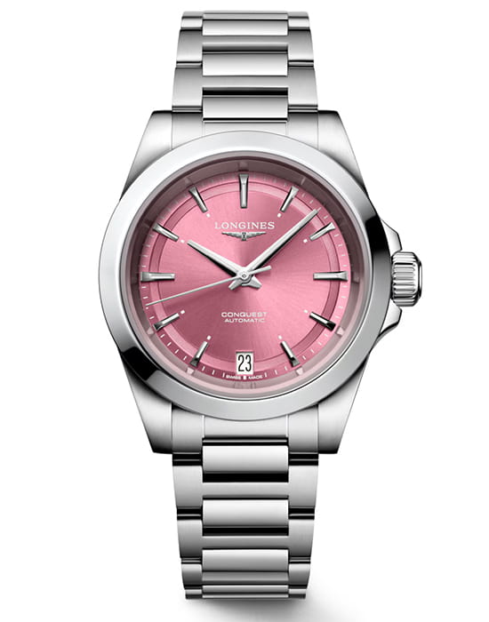 Женские швейцарские механические часы с автоподзаводом Longines Conquest L3.430.4.99.6. Сапфировое стеклоСапфировое стеклоПрочный и надёжный материал из кристалла сапфира синтетического происхождения, характеризующийся особой твёрдостью и устойчивостью к царапинам и повреждениям. устойчивое к появлению царапин, обладающее высокой прозрачностью. Корпус часов изготовлен из нержавеющей стали. Циферблат выполнен по технологии Sunray (солнечные лучи). Стрелки с люминесцентным покрытиемЛюминесцентное покрытиеПозволяет считывать показания времени в темноте. Производители наносят на стрелки, часовые индексы, безель или поверхность циферблата светонакопительный состав, дающий холодное свечение.. Окошко даты в положении 6 часов. Прозрачная задняя крышка. Класс водозащиты: 100 метров, позволит плавать, нырять и заниматься другими водными видами спорта. Стальной браслет на застёжке-бабочке с кнопкамиЗастёжка "бабочка"Такой вид застёжки дополняется предохранителями, помогающими избежать случайного раскрытия браслета. Обладают изящным исполнением. .