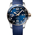 Мужские швейцарские механические часы для дайвинга Longines Hydroconquest L3.782.3.98.9. Сапфировое стеклоСапфировое стеклоПрочный и надёжный материал из кристалла сапфира синтетического происхождения, характеризующийся особой твёрдостью и устойчивостью к царапинам и повреждениям. с многослойным антибликовым покрытием с обеих сторон, устойчивое к появлению царапин, обладающее высокой прозрачностью. Корпус часов изготовлен из стали. Вращающийся безельБезельВнешний ободок, закрепляющий стекло. В спортивных часах так называется поворотное кольцо с делениями на циферблате, выполняет роль таймера – замеряет отрезки времени на шкале. Неподвижный безель – элемент декора. Однонаправленно вращающийся безель на дайверских часах позволяет фиксировать моменты погружения и выныривания на поверхность. из стали с PVD-покрытиемPVDУльтратонкое покрытие наносится в технике вакуумного напыления, сочетает в себе нитрид титана особой прочности со слоем золота или оксида хрома. Несёт в себе декоративную или защитную функцию. и керамики, защищенный от царапин, никогда не изнашивается и не выцветает. Стрелки и метки с люминесцентным покрытиемЛюминесцентное покрытиеПозволяет считывать показания времени в темноте. Производители наносят на стрелки, часовые индексы, безель или поверхность циферблата светонакопительный состав, дающий холодное свечение.. Окошко даты находится в положении 3 часов. Класс водозащиты: 300 метров, позволит плавать, нырять и заниматься другими водными видами спорта. Каучковый ремешок на раскладной застёжкеРаскладная застёжкаТакой тип застёжки используется только на браслетах из металла. Она никогда не раскрывается полностью, происходит разделение на 2 и более частей. Раскладывающая застёжка снизит вероятность потери часов к минимуму..