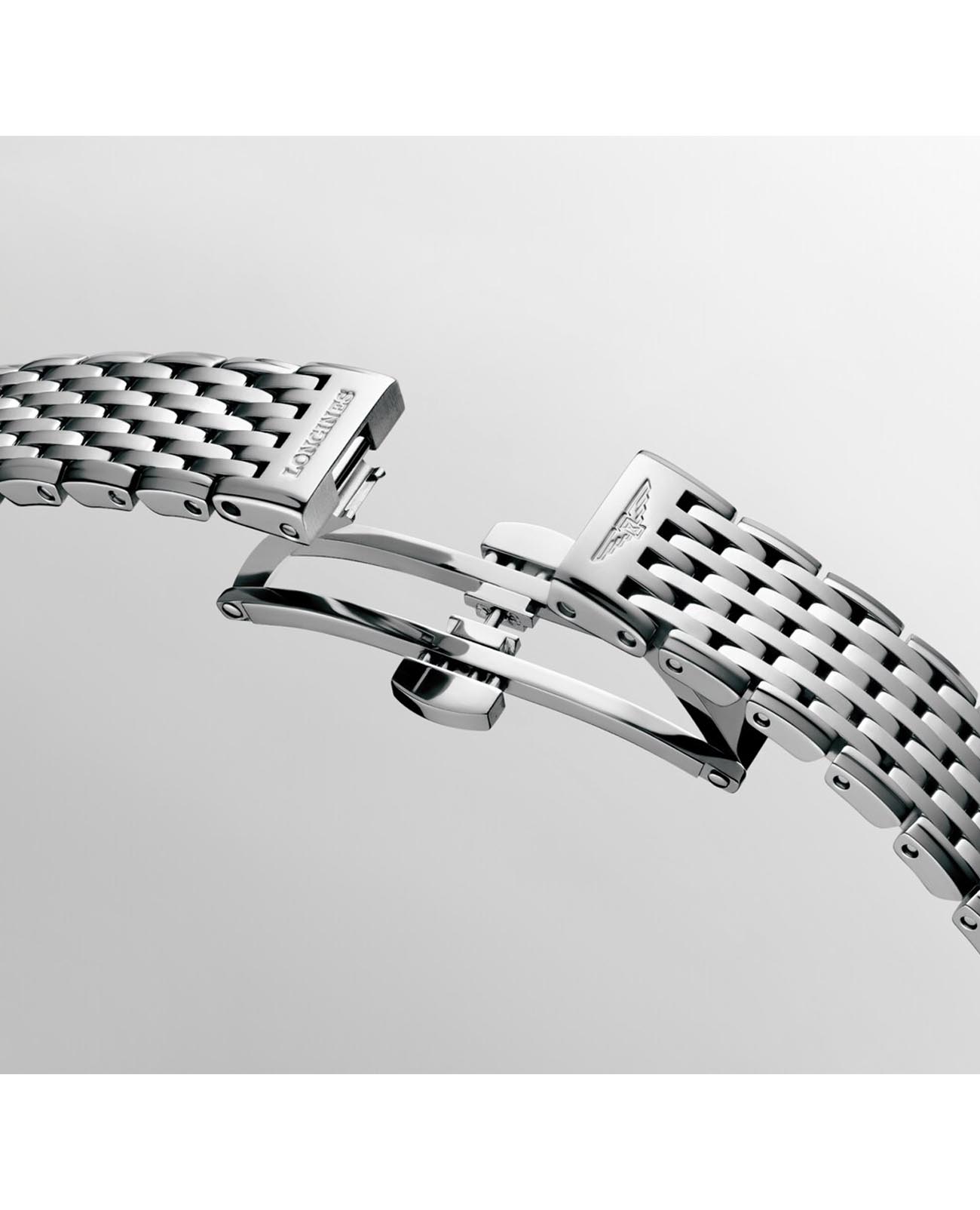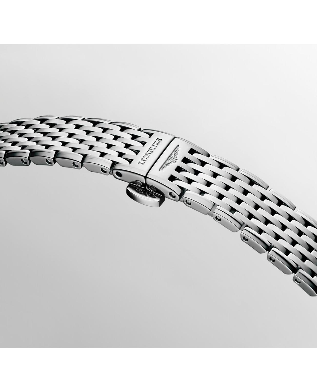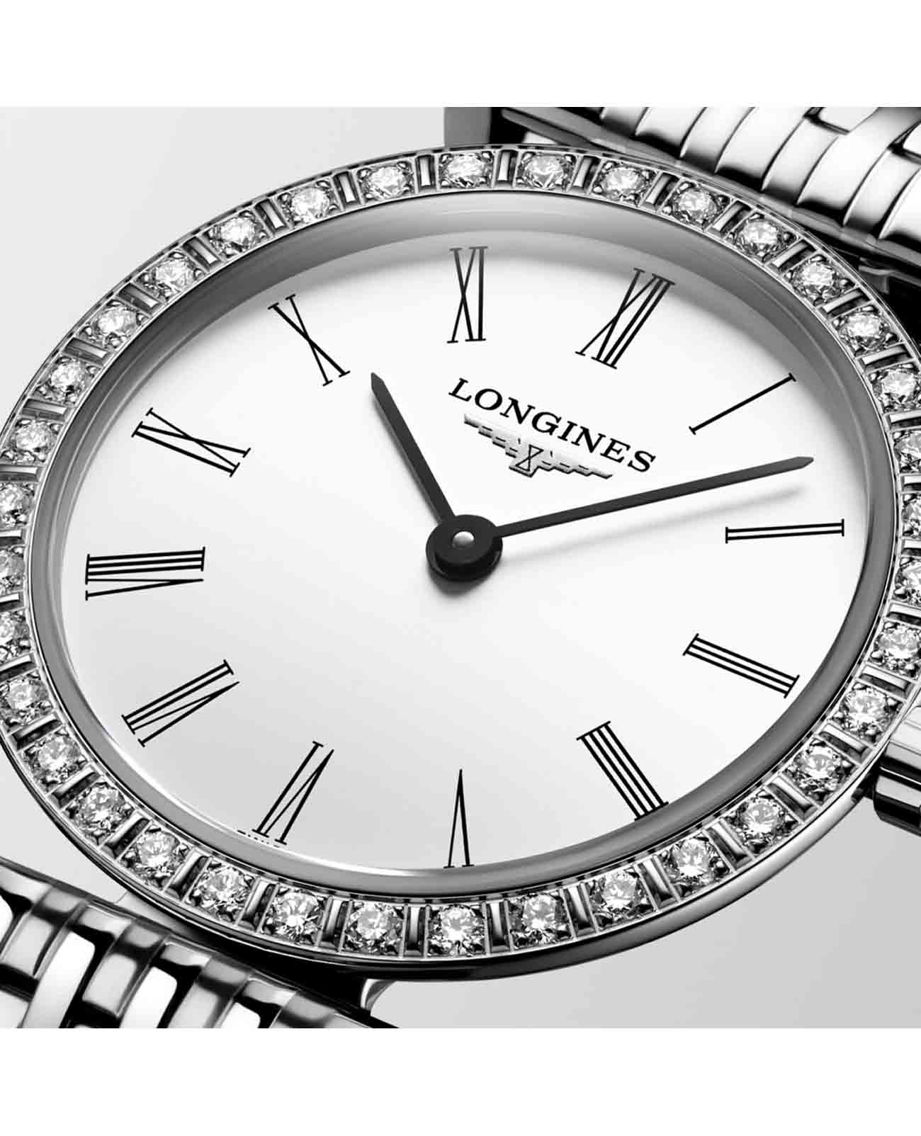 Женские швейцарские часы Longines La Grande Classique L4.341.0.11.6, кварцевый механизм с высокой точностью. Сапфировое стеклоСапфировое стеклоПрочный и надёжный материал из кристалла сапфира синтетического происхождения, характеризующийся особой твёрдостью и устойчивостью к царапинам и повреждениям. устойчивое к появлению царапин, обладающее высокой прозрачностью. Корпус часов изготовлен из стали. БезельБезельВнешний ободок, закрепляющий стекло. В спортивных часах так называется поворотное кольцо с делениями на циферблате, выполняет роль таймера – замеряет отрезки времени на шкале. Неподвижный безель – элемент декора. Однонаправленно вращающийся безель на дайверских часах позволяет фиксировать моменты погружения и выныривания на поверхность. с 36 бриллиантами группы Top Wesselton IF-VVS общим весом 0.302 карата Класс водозащиты: 30 метров, позволит защитить корпус от случайных брызг или капель дождя. Часы укомплектованы стальным браслетом на застёжке-бабочке с кнопкамиЗастёжка "бабочка"Такой вид застёжки дополняется предохранителями, помогающими избежать случайного раскрытия браслета. Обладают изящным исполнением. , превосходно дополняющим эксклюзивный образ модели.