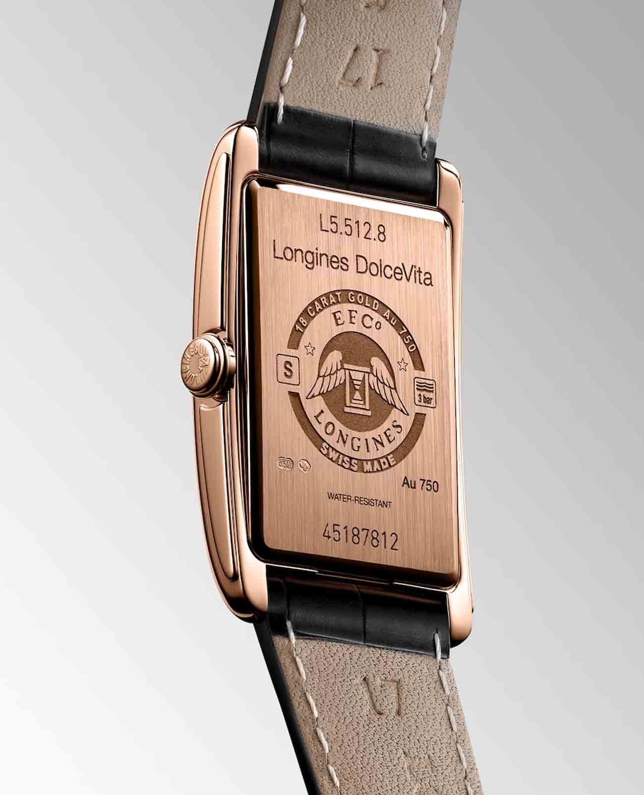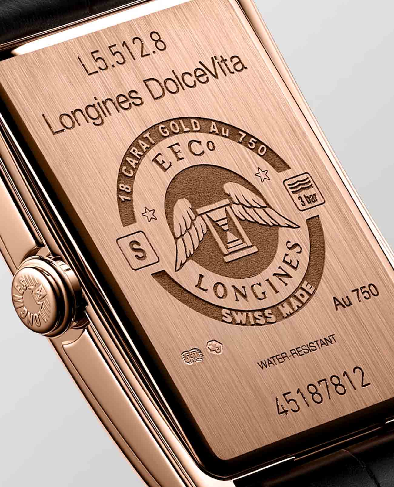 Женские швейцарские часы Longines DolceVita L5.512.8.71.0, кварцевый механизм с высокой точностью. Сапфировое стеклоСапфировое стеклоПрочный и надёжный материал из кристалла сапфира синтетического происхождения, характеризующийся особой твёрдостью и устойчивостью к царапинам и повреждениям. устойчивое к появлению царапин, обладающее высокой прозрачностью. Корпус часов изготовлен из 18-каратного золота18-каратное золотоОбозначение по каратной системе пробирования, оно показывает, сколько драгоценного металла содержится в изделии. 18 карат - в составе 75% чистого золота, соответствует 750 пробе.