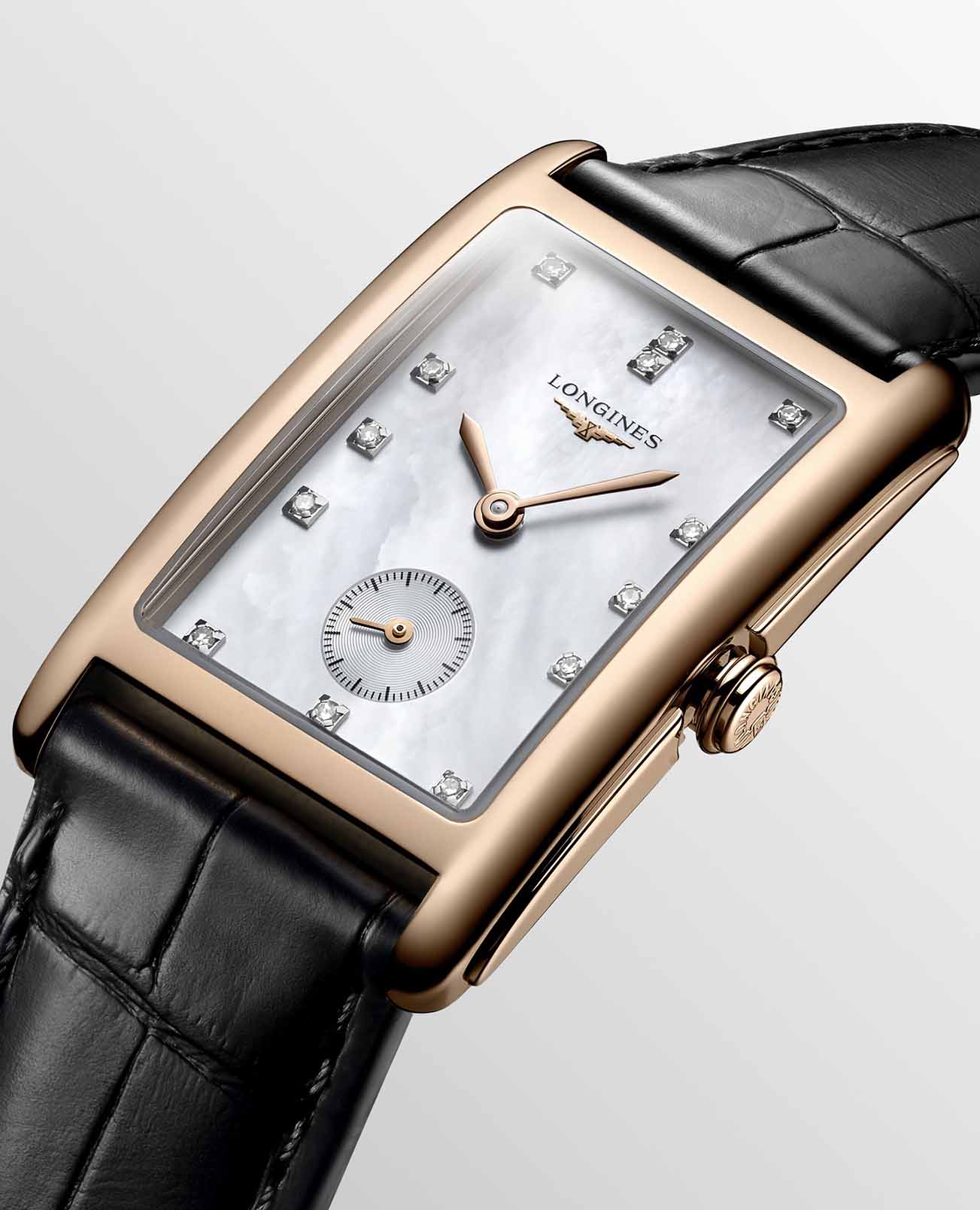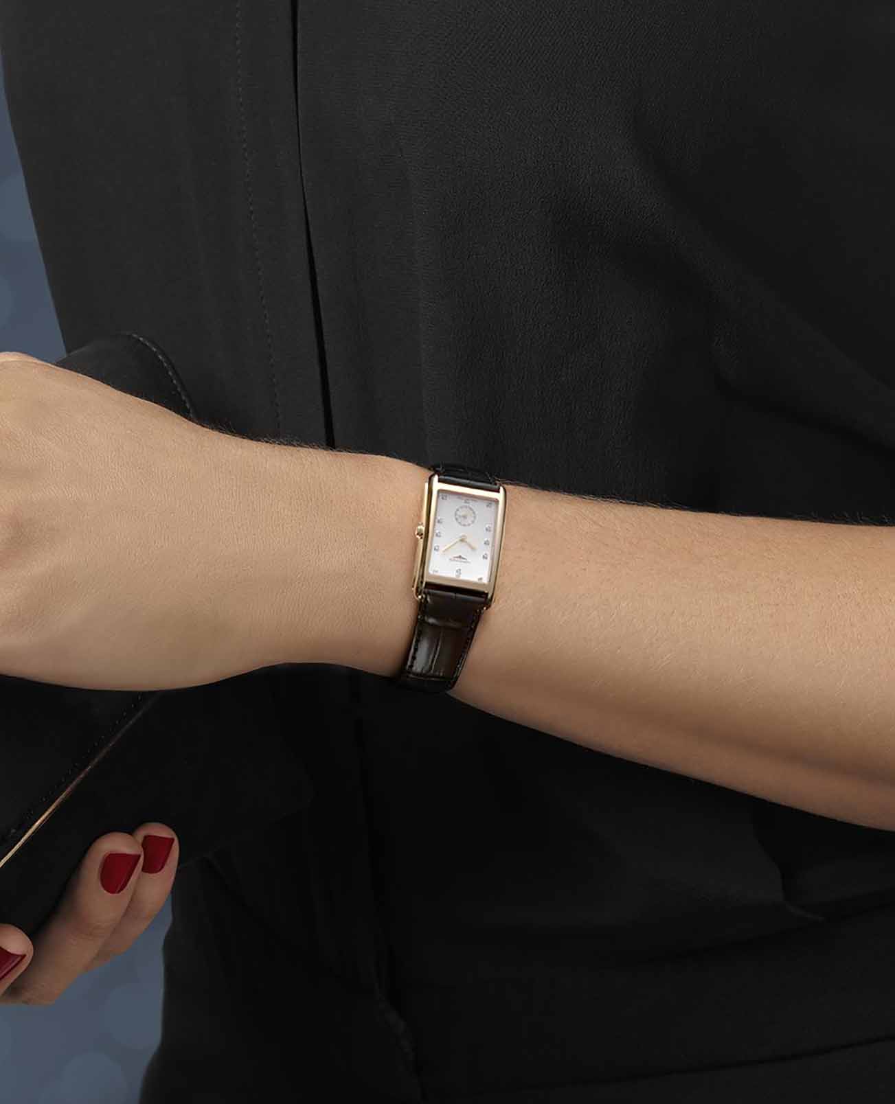 Изящная модель с белым перламутровым циферблатом и корпусом из 18 каратного розового золота инкрустирована 13 бриллиантами весом 0.059 карата. Ремешок выполнен из кожи аллигатора. Швейцарский кварцевый калибр L176 обеспечивает высокую точность хода. Сапфировое стекло устойчиво к царапинам. Наручные часы оснащены индикатором EOLEOLПредставляет собой систему, уведомляющую владельца часов о необходимости замены элемента питания. За 2 недели до полного разряда батарейки секундная стрелка перестаёт ходить чётко и начинает перепрыгивать на 3-4 деления..
