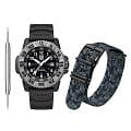 Luminox XL.3513.S.SET — мужская модель из коллекции Navy SEAL с мощным и функциональным дизайном, ориентированным на экстремальные условия. Корпус диаметром 46 мм выполнен из лёгкого и прочного углеродного композита Carbon Core GuardCarbon Core Guard Новейшая структура корпуса, разработанная Casio. Полиуретановая пластина дополнительно усилена карбоновыми вставками, что придаёт специальную защиту от механических повреждений. Карбон отличается лёгкостью и прочностью., а массивный односторонний вращающийся безельБезельВнешний ободок, закрепляющий стекло. В спортивных часах так называется поворотное кольцо с делениями на циферблате, выполняет роль таймера – замеряет отрезки времени на шкале. Неподвижный безель – элемент декора. Однонаправленно вращающийся безель на дайверских часах позволяет фиксировать моменты погружения и выныривания на поверхность. изготовлен из нержавеющей стали и дополнен крупной минутной разметкой для удобства под водой. Защитную функцию выполняет сапфировое стеклоСапфировое стеклоПрочный и надёжный материал из кристалла сапфира синтетического происхождения, характеризующийся особой твёрдостью и устойчивостью к царапинам и повреждениям. с антибликовым покрытиемАнтибликовое покрытиеСлой оксида металла в 0,13-0,3 микрон, благодаря которому стекло часов не бликует и не отражает свет. Антибликовое покрытие уменьшает отражение света в 10 раз, обеспечивая отличную читаемость показателей циферблата., обеспечивающим читаемость в любых условиях. В основе лежит швейцарский кварцевый механизм с индикацией часов, минут, секунд, даты и центральной секундной стрелкой. Водозащита 300 м (30 бар) соответствует профессиональным стандартам дайвинга. Метки и стрелки оснащены системой постоянной подсветки Luminox Light Technology, гарантирующей видимость до 25 лет без подзарядки. Модель укомплектована каучуковым ремешком с классической застёжкой, который обеспечивает комфорт и долговечность в носке. Так же в комплекте идет тканевый ремешок.