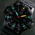 Мужские наручные часы Luminox XS.0321.L из коллекции Leatherback SEA Turtle Giant сочетают в себе спортивный дизайн и надежность швейцарского качества. Модель обладает круглым корпусом диаметром 44 мм, изготовленным из карбонаКарбонОт «carbon», «carbone» - углерод, углепластик - полимерный композиционный материал из переплетённых под определенным углом между собой нитей углеродного волокна, применяется для изготовления лёгких, но прочных деталей. В часах часто используют для украшения циферблатов и ремешков. Так же карбон используется в изготовлении корпусов. Такие корпуса обладают антикоррозионным свойством, не поддаются электромагнитному излучению, обладают повышенной прочностью и противоударностью. (CARBONOX™), что обеспечивает высокую устойчивость к внешним воздействиям при сохранении легкости. Циферблат черного цвета украшен контрастными метками и стрелками с , гарантирующим постоянную видимость времени даже в условиях низкой освещенности. Часы оснащены кварцевым механизмом швейцарского производства, обеспечивающим точность хода. Защиту циферблата обеспечивает прочное минеральное стеклоМинеральное стеклоМинеральное стекло представляет собой искусственно выращенный минерал кварца. Такое стекло отличается особой устойчивостью к повреждениям и царапинам. Уступает по некоторым качествам сапфировому стеклу., устойчивое к царапинам и механическим повреждениям . Водонепроницаемость модели достигает 10 атмосфер (100 метров), что делает их подходящими для плавания и активного отдыха на воде. Модель также оснащена безелемБезельВнешний ободок, закрепляющий стекло. В спортивных часах так называется поворотное кольцо с делениями на циферблате, выполняет роль таймера – замеряет отрезки времени на шкале. Неподвижный безель – элемент декора. Однонаправленно вращающийся безель на дайверских часах позволяет фиксировать моменты погружения и выныривания на поверхность. с односторонним вращением, что добавляет функциональности при использовании в водных условиях. Ремешок выполнен из черного силикона, что обеспечивает комфортное ношение в течение дня. Дополнительно часы имеют окно даты в положении «3 часа», что делает их практичными для повседневного использования.