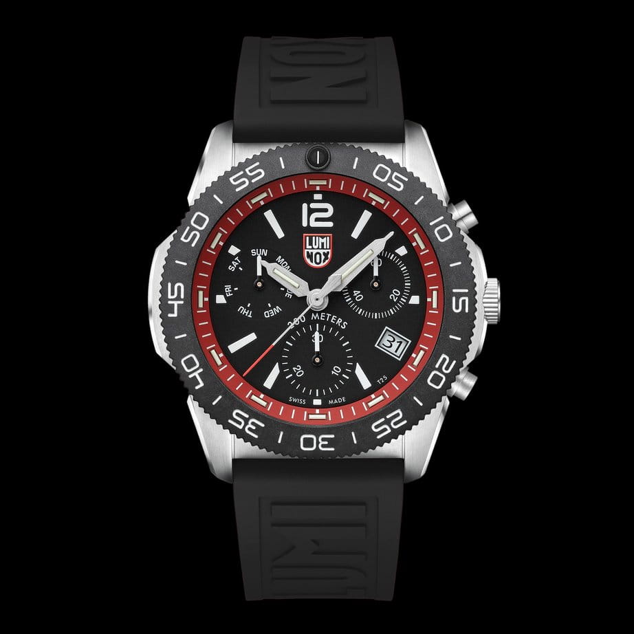 Швейцарские наручные часы Luminox Pacific Diver Chronograph XS.3155.SET – это идеальный симбиоз стиля и высокой функциональности. Оснащенные высокоточным кварцевым механизмом, они гарантируют безупречное времяизмерение и надежность в любом случае. Часы-хронографХронографФункция позволяет измерять отрезки времени с особой точностью: часы, минуты, секунды. Верным признаком хронографа является наличие на циферблате 3 дополнительных окошек-счётчиков. обладают функцией секундомераСекундомерСекундоме́р — прибор, способный измерять интервалы времени с точностью до долей секунды., что делает их практичными в использовании. Циферблат этих часов защищен сапфировым стекломСапфировое стеклоПрочный и надёжный материал из кристалла сапфира синтетического происхождения, характеризующийся особой твёрдостью и устойчивостью к царапинам и повреждениям. с антибликовым покрытиемАнтибликовое покрытиеСлой оксида металла в 0,13-0,3 микрон, благодаря которому стекло часов не бликует и не отражает свет. Антибликовое покрытие уменьшает отражение света в 10 раз, обеспечивая отличную читаемость показателей циферблата., которое славится своей прочностью и устойчивостью к царапинам, обеспечивая кристально чистый обзор. Корпус часов выполнен из качественной стали, что свидетельствует о долговечности и прочности изделия. Стрелки с LLTLLTLLT — это автономный механизм подсветки, основанный на использовании микроскопических газонаполненных элементов. Специальные герметичные капсулы из боросиликатного стекла, интегрированные в циферблат, генерируют свечение без необходимости подключения к внешним источникам энергии. Для их работы не требуется ни дополнительный свет, ни механическое воздействие (например, нажатие кнопки). Свечение возникает благодаря химическому процессу: реакция между тритием, заключенным в капсулах, и люминофорным покрытием создает стабильное автономное освещение. Технология обеспечивает энергетическую независимость и долговечность подсветки.-подсветкой, обеспечивают отличную видимость даже в условиях недостаточной освещенности, что делает их удобными для использования в любых условиях. Дополнительно часы располагают окошком даты в положении 4 часа, позволяющим быстро и удобно отслеживать текущую дату. Их внушительный класс водозащиты в 200 метров делает их идеальными для любителей водных видов спорта, таких как плавание и ныряние, не беспокоясь о повреждении механизма. Каучуковый красный ремешок, надёжно фиксирующий часы на запястье с помощью раскладной застёжкиРаскладная застёжкаТакой тип застёжки используется только на браслетах из металла. Она никогда не раскрывается полностью, происходит разделение на 2 и более частей. Раскладывающая застёжка снизит вероятность потери часов к минимуму., обеспечивает комфортное ношение в течение всего дня. Стильный вращающийся безельБезельВнешний ободок, закрепляющий стекло. В спортивных часах так называется поворотное кольцо с делениями на циферблате, выполняет роль таймера – замеряет отрезки времени на шкале. Неподвижный безель – элемент декора. Однонаправленно вращающийся безель на дайверских часах позволяет фиксировать моменты погружения и выныривания на поверхность., изготовленный из карбонаКарбонОт «carbon», «carbone» - углерод, углепластик - полимерный композиционный материал из