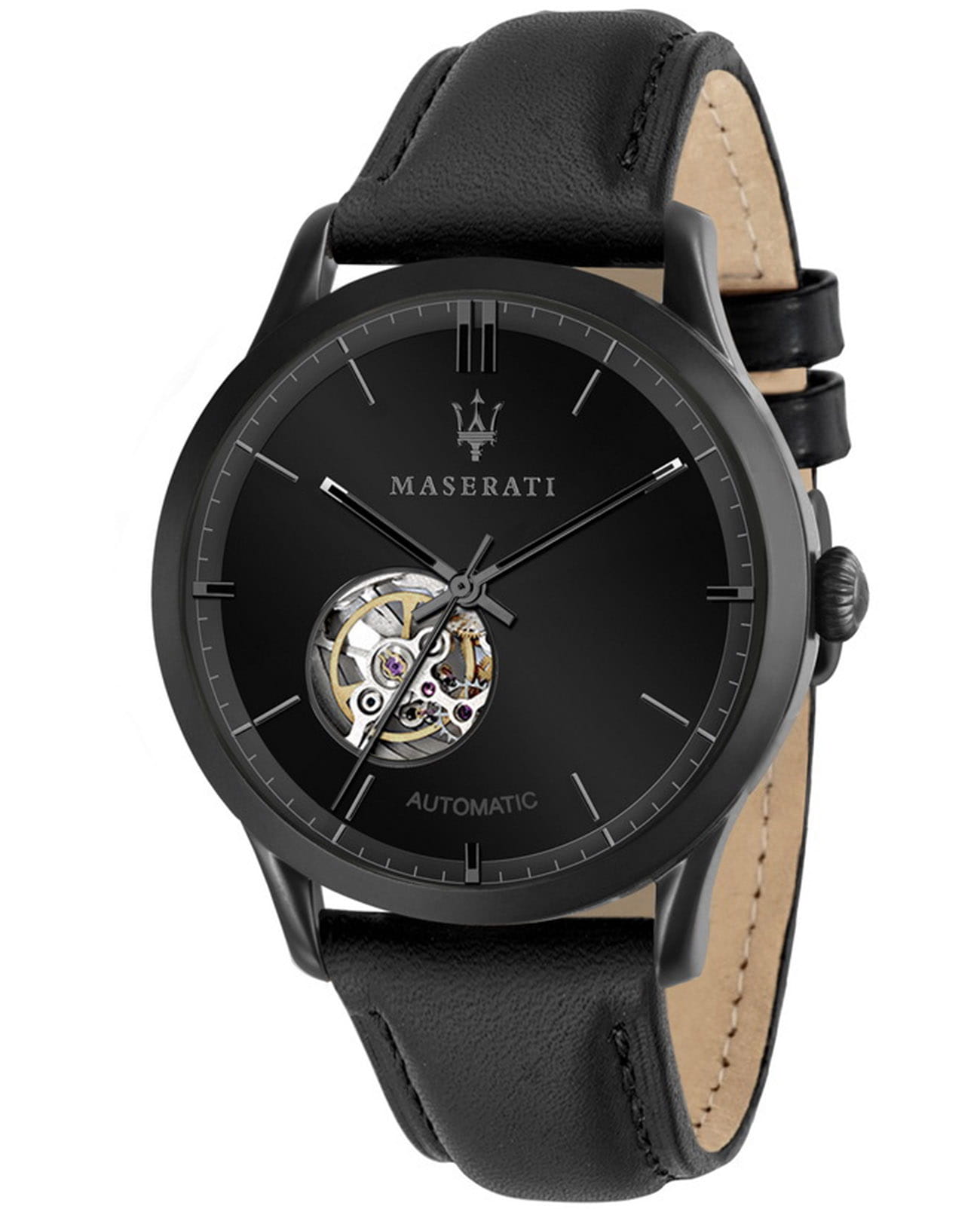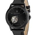 Мужские механические часы Maserati — это стильный аксессуар, сочетающий элегантность итальянского дизайна с надёжностью швейцарской часовой традиции. Корпус диаметром 42 мм выполнен из нержавеющей стали с PVD-покрытиемPVDУльтратонкое покрытие наносится в технике вакуумного напыления, сочетает в себе нитрид титана особой прочности со слоем золота или оксида хрома. Несёт в себе декоративную или защитную функцию. чёрного цвета, придающим часам глубокий, благородный оттенок и повышенную устойчивость к царапинам. Циферблат чёрного цвета оформлен в стиле полускелетон: через окошко можно наблюдать за работой автоматического механизма, что добавляет изделию технической выразительности и индивидуальности. Циферблат защищён прочным минеральным стекломМинеральное стеклоМинеральное стекло представляет собой искусственно выращенный минерал кварца. Такое стекло отличается особой устойчивостью к повреждениям и царапинам. Уступает по некоторым качествам сапфировому стеклу., устойчивым к мелким повреждениям. Часы оснащены кожаным ремешком чёрного цвета с классической пряжкой, обеспечивающим комфорт при ношении. Водонепроницаемость 50 м позволяет использовать часы в повседневных условиях. Гарантия — 2 года. Идеальный выбор для тех, кто ценит современный дизайн, технологичность и дух автоспорта, воплощённый в деталях.