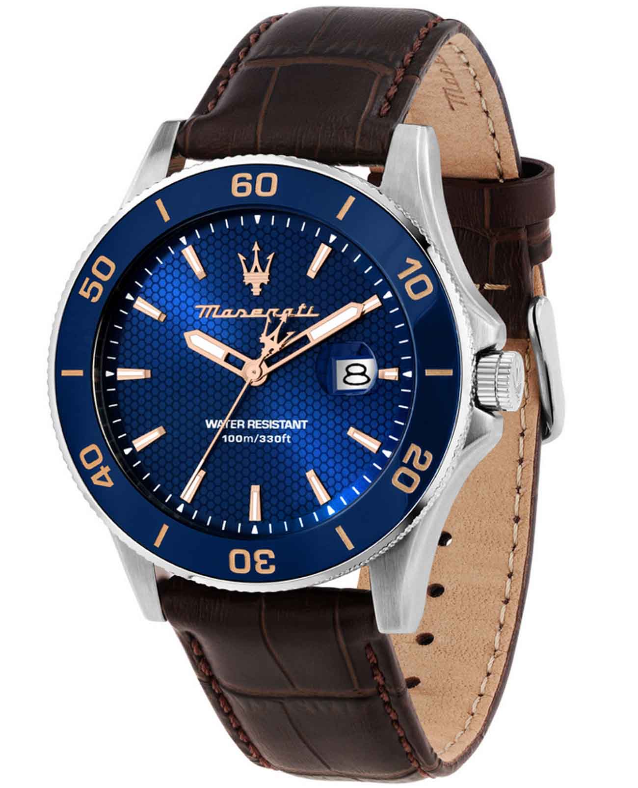 Мужские итальянские часы Maserati Competizione R8851100004, кварцевый механизм с высокой точностью. Корпус часов изготовлен из стали. БезельБезельВнешний ободок, закрепляющий стекло. В спортивных часах так называется поворотное кольцо с делениями на циферблате, выполняет роль таймера – замеряет отрезки времени на шкале. Неподвижный безель – элемент декора. Однонаправленно вращающийся безель на дайверских часах позволяет фиксировать моменты погружения и выныривания на поверхность. из стали с PVD-покрытиемPVDУльтратонкое покрытие наносится в технике вакуумного напыления, сочетает в себе нитрид титана особой прочности со слоем золота или оксида хрома. Несёт в себе декоративную или защитную функцию.. Стрелки с люминесцентным покрытиемЛюминесцентное покрытиеПозволяет считывать показания времени в темноте. Производители наносят на стрелки, часовые индексы, безель или поверхность циферблата светонакопительный состав, дающий холодное свечение.. Окошко даты находится в положении 3 часа. Класс водозащиты: 100 метров, позволит плавать, нырять и заниматься другими водными видами спорта. Кожаный ремешок на стандартной застежке.