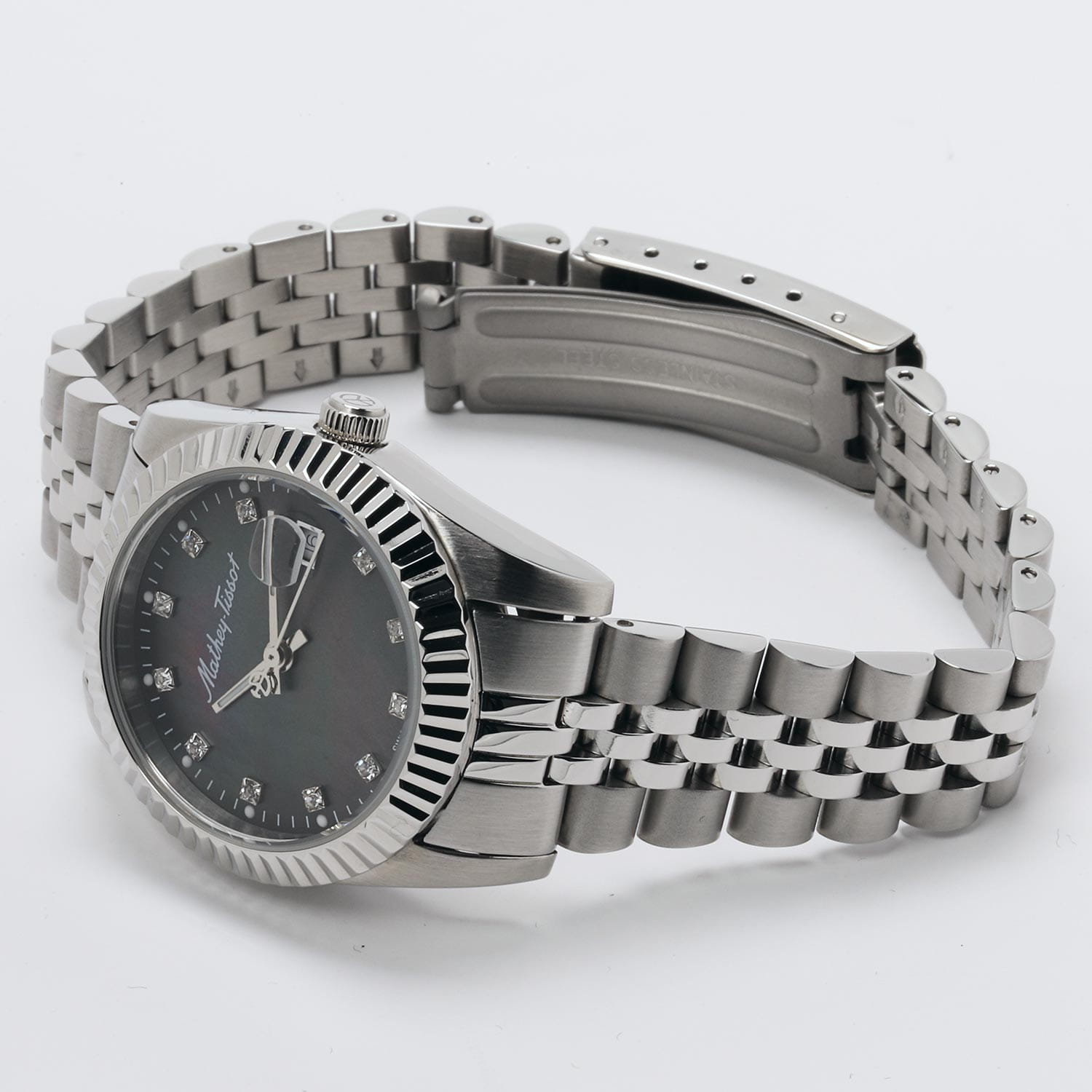 Женские кварцевые часы Mathey-Tissot Mathy D910AN — это стильное сочетание элегантности и современного дизайна. Изящный корпус выполнен из нержавеющей стали, диаметром 32 мм, что придаст образу женственности и романтизма. Изысканный циферблат с метками в виде точек украшены цирконами, что придает модели особый блеск. Циферблат защищен минеральным стекломМинеральное стеклоМинеральное стекло представляет собой искусственно выращенный минерал кварца. Такое стекло отличается особой устойчивостью к повреждениям и царапинам. Уступает по некоторым качествам сапфировому стеклу., обеспечивающий устойчивость к царапинам. Стрелки с люминесцентным покрытиемЛюминесцентное покрытиеПозволяет считывать показания времени в темноте. Производители наносят на стрелки, часовые индексы, безель или поверхность циферблата светонакопительный состав, дающий холодное свечение.. Окошко даты находится в положении 3 часа. Часы оснащены надежным кварцевым механизмом. Стальной браслет на раскладной застёжкеРаскладная застёжкаТакой тип застёжки используется только на браслетах из металла. Она никогда не раскрывается полностью, происходит разделение на 2 и более частей. Раскладывающая застёжка снизит вероятность потери часов к минимуму., гарантирует комфортное и безопасное ношение. Класс водозащиты: 50 метров позволит защитить корпус от случайных брызг или капель дождя. Mathey-Tissot  — отличный выбор для тех, кто ценит утонченность и качество.