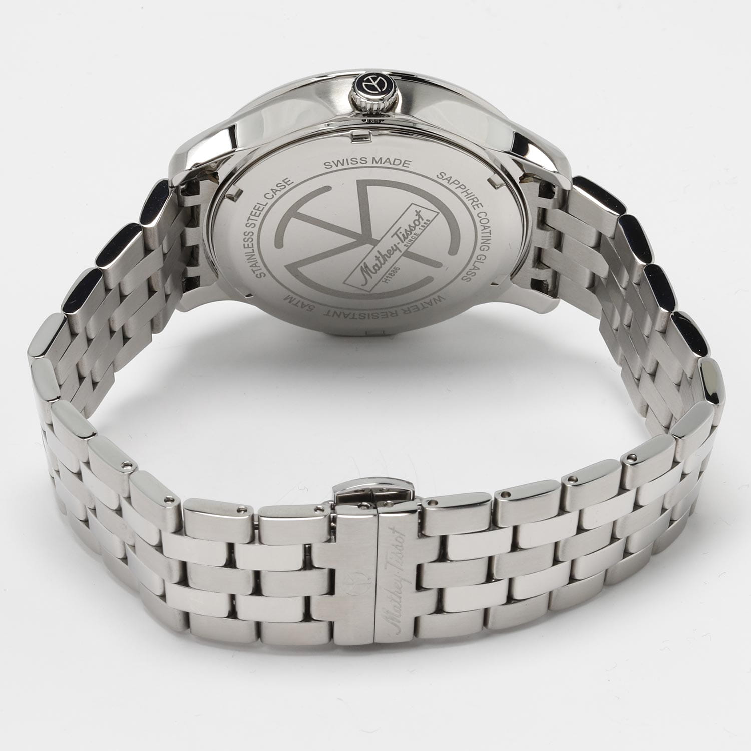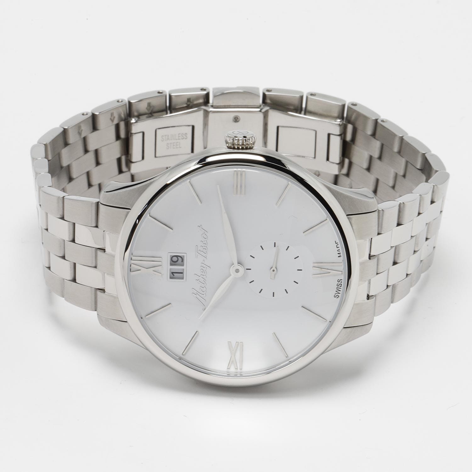 Мужские кварцевые часы Mathey-Tissot Edmond Metal H1886MAI — это стильное сочетание элегантности и современного дизайна. Изящный корпус выполнен из нержавеющей стали, диаметром 42 мм, что придаст образу элегантности и надежности. Изысканный циферблат с метками в виде штрихов и римских цифр придает модели особый блеск. Циферблат защищен минеральным стекломМинеральное стеклоМинеральное стекло представляет собой искусственно выращенный минерал кварца. Такое стекло отличается особой устойчивостью к повреждениям и царапинам. Уступает по некоторым качествам сапфировому стеклу. с сапфировым покрытием, обеспечивает устойчивость к царапинам. Окошко даты находится в положении 12 часов. Стальной браслет на застёжке-бабочке с кнопкамиЗастёжка "бабочка"Такой вид застёжки дополняется предохранителями, помогающими избежать случайного раскрытия браслета. Обладают изящным исполнением. , гарантирует комфортное и безопасное ношение. Секундная стрелка вынесена на отдельный циферблат. Рифленая заводная головка. Класс водозащиты: 50 метров позволит защитить корпус от случайных брызг или капель дождя. Mathey-Tissot — отличный выбор для тех, кто ценит утонченность и качество.