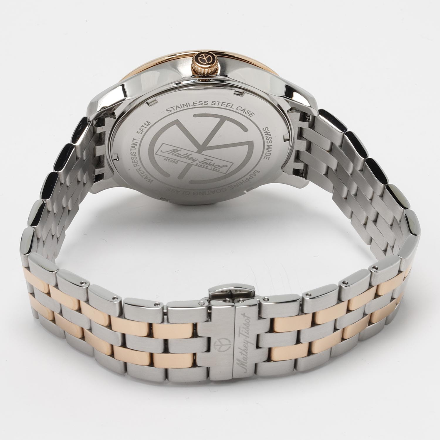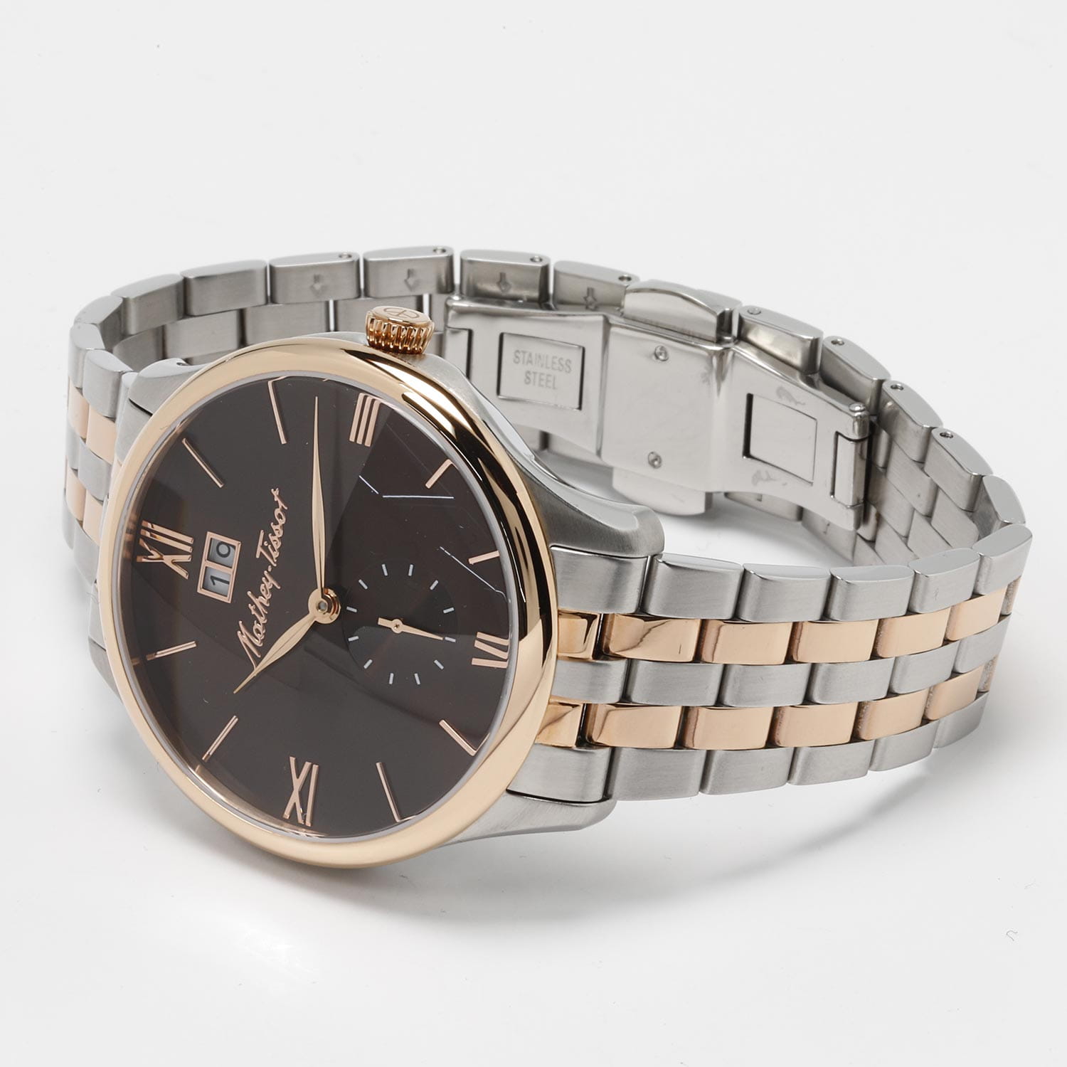 Мужские кварцевые часы Mathey-Tissot Edmond Metal H1886MRM — это стильное сочетание элегантности и современного дизайна. Изящный корпус выполнен из нержавеющей стали, диаметром 42 мм, что придаст образу элегантности и надежности. БезельБезельВнешний ободок, закрепляющий стекло. В спортивных часах так называется поворотное кольцо с делениями на циферблате, выполняет роль таймера – замеряет отрезки времени на шкале. Неподвижный безель – элемент декора. Однонаправленно вращающийся безель на дайверских часах позволяет фиксировать моменты погружения и выныривания на поверхность. с PVD-покрытиемPVDУльтратонкое покрытие наносится в технике вакуумного напыления, сочетает в себе нитрид титана особой прочности со слоем золота или оксида хрома. Несёт в себе декоративную или защитную функцию.. Изысканный циферблат с метками в виде штрихов и римских цифр придает модели особый блеск. Циферблат защищен минеральным стекломМинеральное стеклоМинеральное стекло представляет собой искусственно выращенный минерал кварца. Такое стекло отличается особой устойчивостью к повреждениям и царапинам. Уступает по некоторым качествам сапфировому стеклу. с сапфировым покрытием, обеспечивает устойчивость к царапинам. Окошко даты находится в положении 12 часов. Стальной браслет с частичным PVD-покрытиемPVDУльтратонкое покрытие наносится в технике вакуумного напыления, сочетает в себе нитрид титана особой прочности со слоем золота или оксида хрома. Несёт в себе декоративную или защитную функцию. на застёжке-бабочке с кнопкамиЗастёжка "бабочка"Такой вид застёжки дополняется предохранителями, помогающими избежать случайного раскрытия браслета. Обладают изящным исполнением. , гарантирует комфортное и безопасное ношение. Секундная стрелка вынесена на отдельный циферблат. Рифленая заводная головка. Класс водозащиты: 50 метров позволит защитить корпус от случайных брызг или капель дождя. Mathey-Tissot — отличный выбор для тех, кто ценит утонченность и качество.