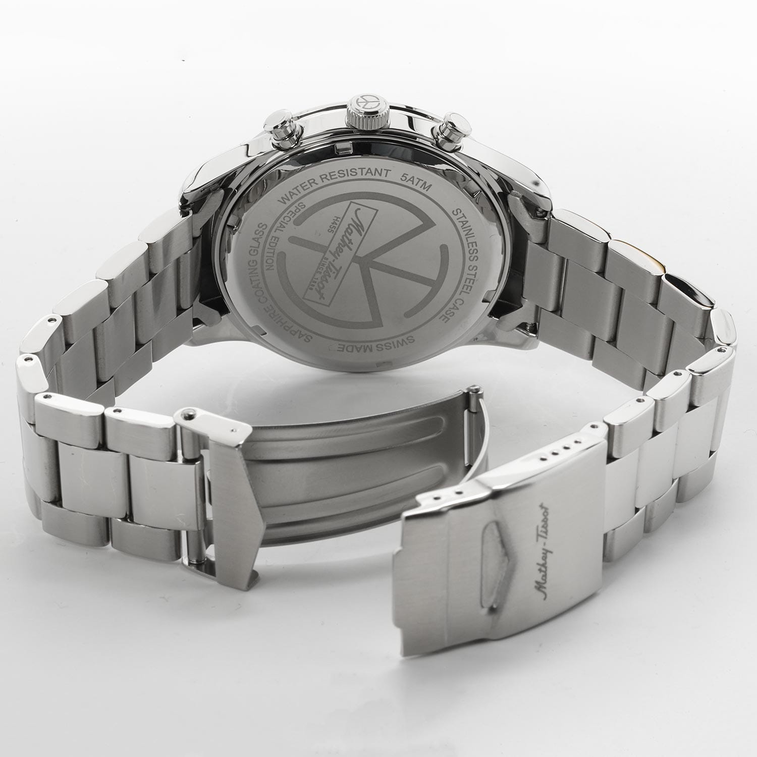 Мужские кварцевые часы-хронографХронографФункция позволяет измерять отрезки времени с особой точностью: часы, минуты, секунды. Верным признаком хронографа является наличие на циферблате 3 дополнительных окошек-счётчиков. с секундомеромСекундомерСекундоме́р — прибор, способный измерять интервалы времени с точностью до долей секунды. Mathey-Tissot Mathy H455CHVE — это стильное сочетание элегантности и современного дизайна. Изящный корпус выполнен из нержавеющей стали, диаметром 44 мм, что придаст образу элегантности и надежности. Изысканный циферблат с метками в виде штрихов придает модели особый блеск. Циферблат защищен минеральным стекломМинеральное стеклоМинеральное стекло представляет собой искусственно выращенный минерал кварца. Такое стекло отличается особой устойчивостью к повреждениям и царапинам. Уступает по некоторым качествам сапфировому стеклу. с сапфировым покрытием, обеспечивает устойчивость к царапинам. Стрелки и метки с люминесцентным покрытиемЛюминесцентное покрытиеПозволяет считывать показания времени в темноте. Производители наносят на стрелки, часовые индексы, безель или поверхность циферблата светонакопительный состав, дающий холодное свечение.. Окошко даты находится в положении 4 часа. Стальной браслет на раскладной застёжке с фиксаторомРаскладная застёжкаТакой тип застёжки используется только на браслетах из металла. Она никогда не раскрывается полностью, происходит разделение на 2 и более частей. Раскладывающая застёжка снизит вероятность потери часов к минимуму., гарантирует комфортное и безопасное ношение. Рифленая заводная головка. Класс водозащиты: 50 метров позволит защитить корпус от случайных брызг или капель дождя. Mathey-Tissot  — отличный выбор для тех, кто ценит утонченность и качество.