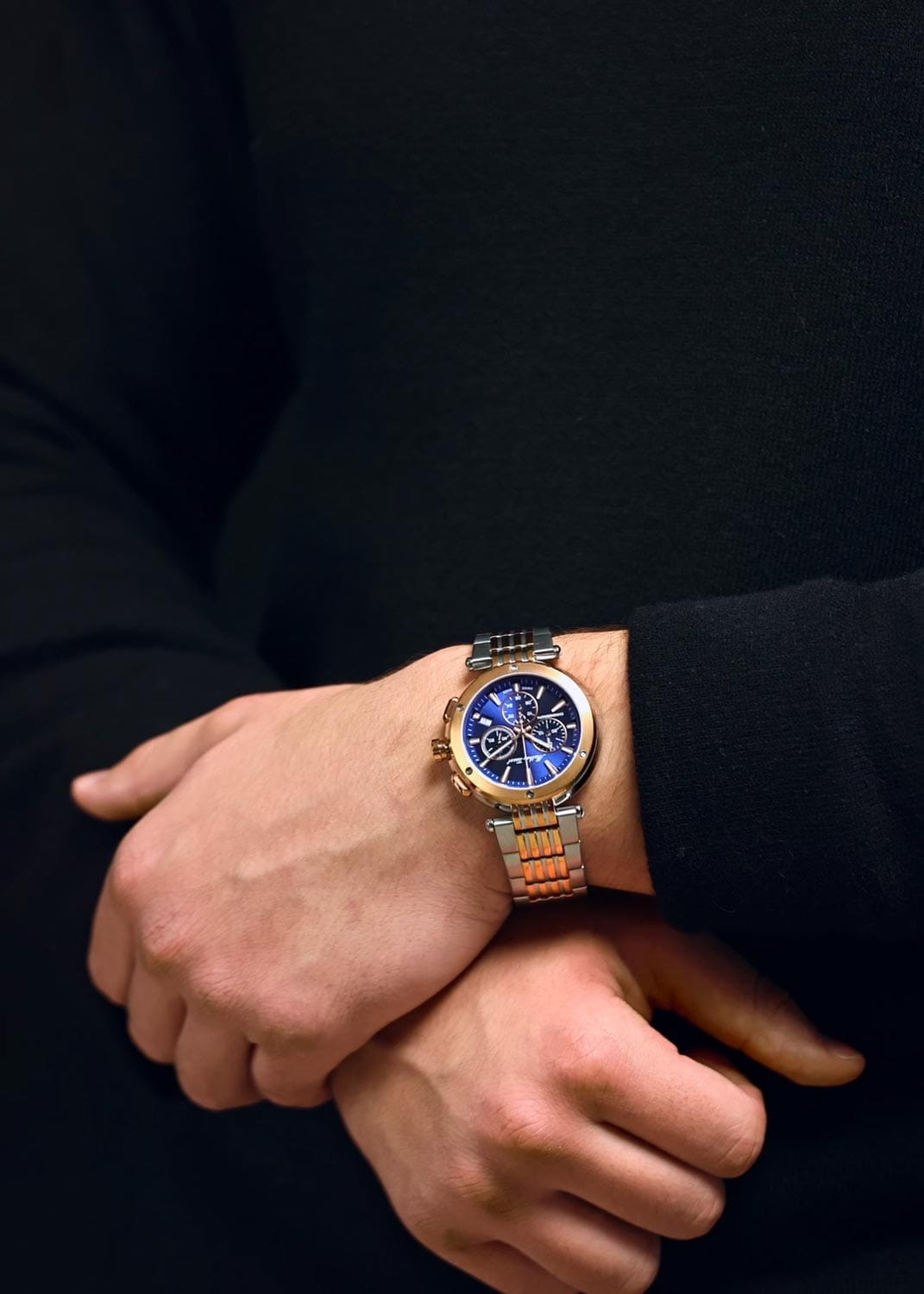 Мужские кварцевые часы-хронографХронографФункция позволяет измерять отрезки времени с особой точностью: часы, минуты, секунды. Верным признаком хронографа является наличие на циферблате 3 дополнительных окошек-счётчиков. Mathey-Tissot Neptune H912CHRBU — это стильное сочетание элегантности и современного дизайна. Изящный корпус выполнен из нержавеющей стали серебристого цвета, диаметром 42 мм, что придаст образу элегантности и надежности. Изысканный циферблат с метками в виде штрихов придает модели особый блеск. Циферблат защищен минеральным стекломМинеральное стеклоМинеральное стекло представляет собой искусственно выращенный минерал кварца. Такое стекло отличается особой устойчивостью к повреждениям и царапинам. Уступает по некоторым качествам сапфировому стеклу. с сапфировым покрытием, обеспечивает устойчивость к царапинам. Стрелки и метки с люминесцентным покрытиемЛюминесцентное покрытиеПозволяет считывать показания времени в темноте. Производители наносят на стрелки, часовые индексы, безель или поверхность циферблата светонакопительный состав, дающий холодное свечение.. БезельБезельВнешний ободок, закрепляющий стекло. В спортивных часах так называется поворотное кольцо с делениями на циферблате, выполняет роль таймера – замеряет отрезки времени на шкале. Неподвижный безель – элемент декора. Однонаправленно вращающийся безель на дайверских часах позволяет фиксировать моменты погружения и выныривания на поверхность. с PVD-покрытиемPVDУльтратонкое покрытие наносится в технике вакуумного напыления, сочетает в себе нитрид титана особой прочности со слоем золота или оксида хрома. Несёт в себе декоративную или защитную функцию. украшен винтами. Окошко даты находится в положении 4 часа. Часы оснащены надежным кварцевым механизмом. Стальной браслет с частичным PVD-покрытиемPVDУльтратонкое покрытие наносится в технике вакуумного напыления, сочетает в себе нитрид титана особой прочности со слоем золота или оксида хрома. Несёт в себе декоративную или защитную функцию. на застёжке-бабочке с кнопкамиЗастёжка "бабочка"Такой вид застёжки дополняется предохранителями, помогающими избежать случайного раскрытия браслета. Обладают изящным исполнением. , гарантирует комфортное и безопасное ношение. Класс водозащиты: 50 метров позволит защитить корпус от случайных брызг или капель дождя. Mathey-Tissot  — отличный выбор для тех, кто ценит утонченность и качество.