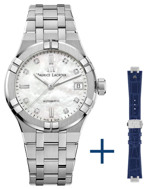 Женские швейцарские механические часы с бриллиантами с дополнительным ремешком Maurice Lacroix Aikon Automatic AI6006-SS002-170-3, механический механизм (автоматический калибр) с высокой точностью. Сапфировое стекло устойчивое к появлению царапин, обладающее высокой прозрачностью. Класс водозащиты: 200 метров, позволит плавать, нырять и заниматься другими водными видами спорта. Корпус часов изготовлен из стали, серебристого цвета.