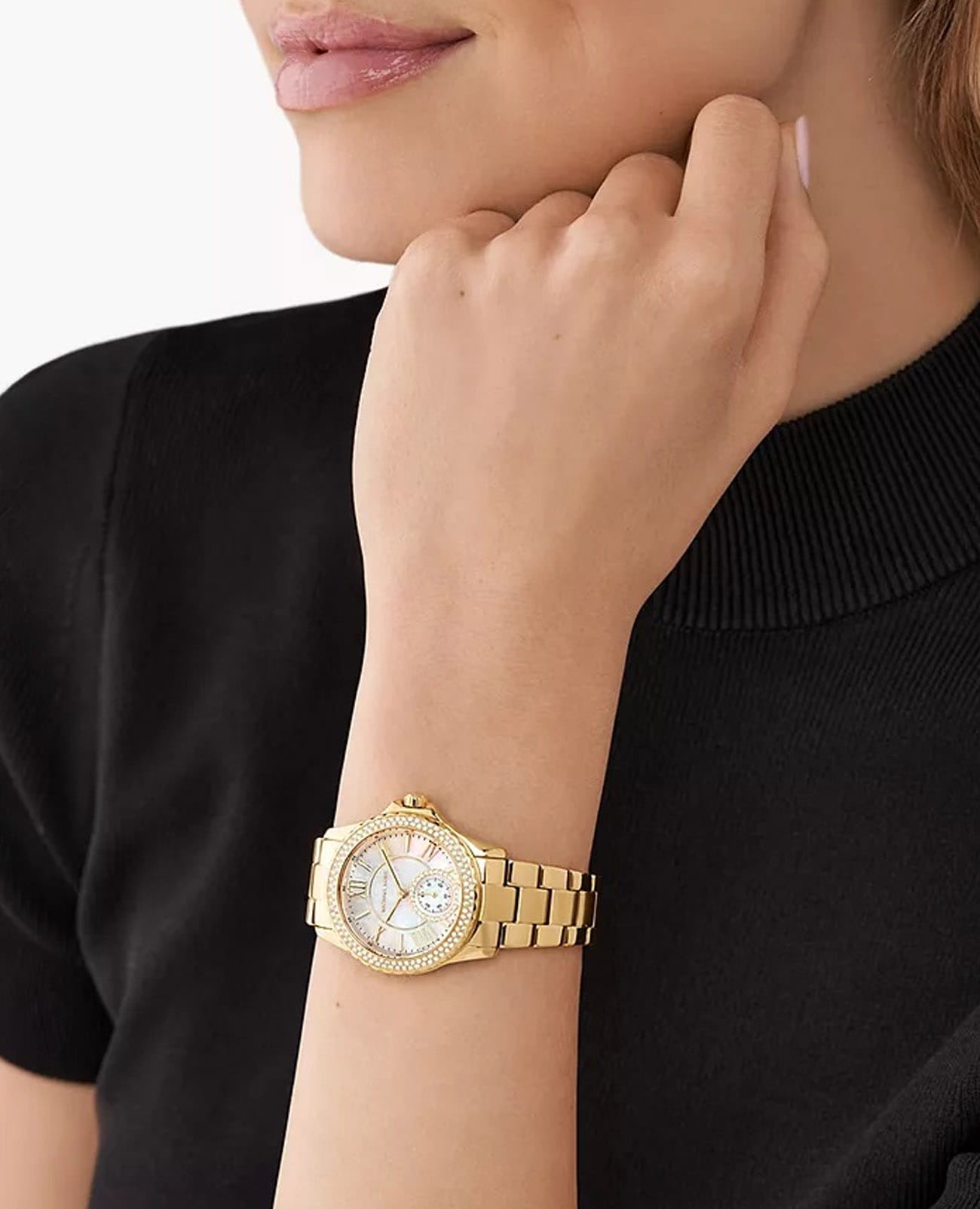 Женские американские часы с секундомеромСекундомерСекундоме́р — прибор, способный измерять интервалы времени с точностью до долей секунды. и с минеральным стекломМинеральное стеклоМинеральное стекло представляет собой искусственно выращенный минерал кварца. Такое стекло отличается особой устойчивостью к повреждениям и царапинам. Уступает по некоторым качествам сапфировому стеклу. Michael Kors Everest MK7363, кварцевый механизм с высокой точностью. Корпус часов изготовлен из нержавеющей стали с PVD-покрытиемPVDУльтратонкое покрытие наносится в технике вакуумного напыления, сочетает в себе нитрид титана особой прочности со слоем золота или оксида хрома. Несёт в себе декоративную или защитную функцию.. БезельБезельВнешний ободок, закрепляющий стекло. В спортивных часах так называется поворотное кольцо с делениями на циферблате, выполняет роль таймера – замеряет отрезки времени на шкале. Неподвижный безель – элемент декора. Однонаправленно вращающийся безель на дайверских часах позволяет фиксировать моменты погружения и выныривания на поверхность. и циферблат украшены кристаллами. Метки в виде штрихов и римских цифр. Секундная стрелка вынесена на малый циферблат. Метки с люминесцентным покрытиемЛюминесцентное покрытиеПозволяет считывать показания времени в темноте. Производители наносят на стрелки, часовые индексы, безель или поверхность циферблата светонакопительный состав, дающий холодное свечение.. Заводная головка с защитой. Класс водозащиты: 50 метров, позволит защитить корпус от случайных брызг или капель дождя. Стальной браслет с PVD-покрытиемPVDУльтратонкое покрытие наносится в технике вакуумного напыления, сочетает в себе нитрид титана особой прочности со слоем золота или оксида хрома. Несёт в себе декоративную или защитную функцию. на раскладной застёжкеРаскладная застёжкаТакой тип застёжки используется только на браслетах из металла. Она никогда не раскрывается полностью, происходит разделение на 2 и более частей. Раскладывающая застёжка снизит вероятность потери часов к минимуму..