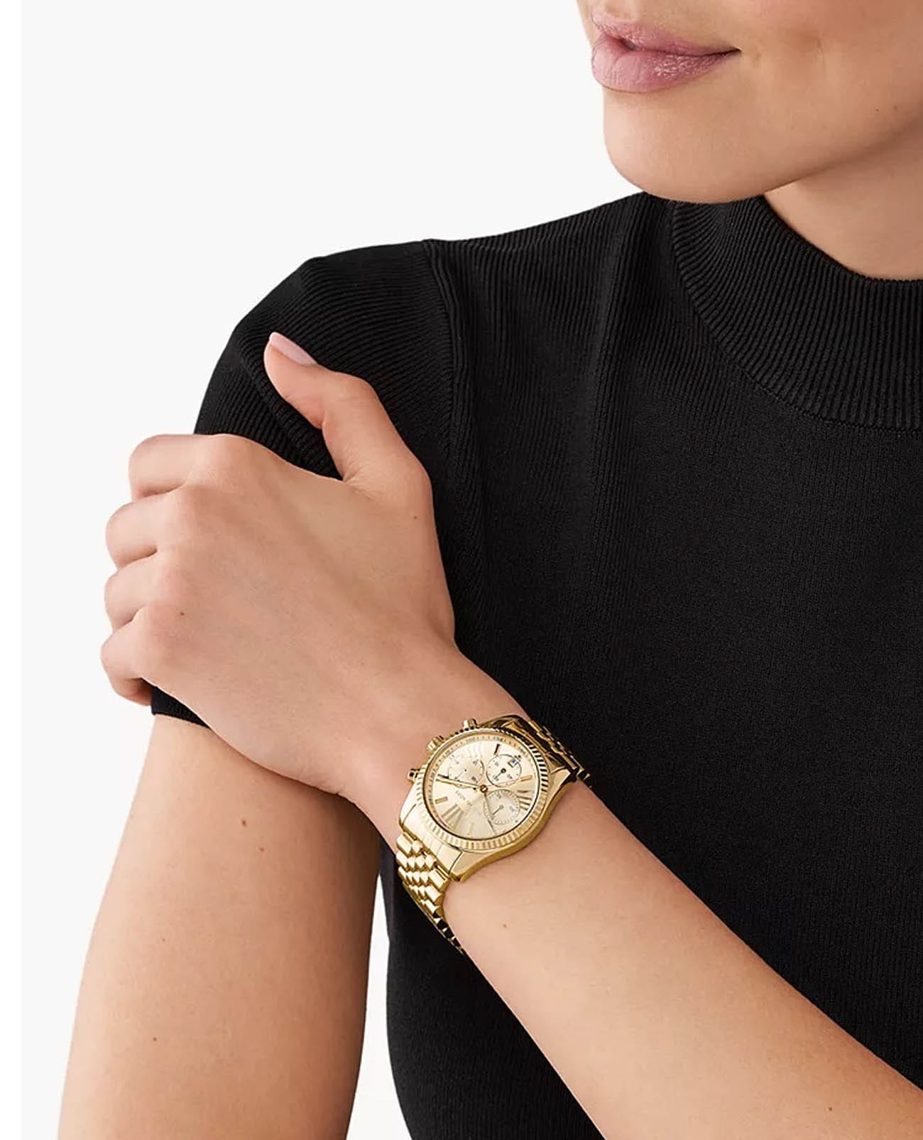 Женские часы-хронографХронографФункция позволяет измерять отрезки времени с особой точностью: часы, минуты, секунды. Верным признаком хронографа является наличие на циферблате 3 дополнительных окошек-счётчиков. Michael Kors Lexington MK7378, кварцевый механизм с высокой точностью. Минеральное стеклоМинеральное стеклоМинеральное стекло представляет собой искусственно выращенный минерал кварца. Такое стекло отличается особой устойчивостью к повреждениям и царапинам. Уступает по некоторым качествам сапфировому стеклу. устойчивое к появлению царапин, обладающее высокой прозрачностью. Корпус и браслет изготовлены из нержавеющей стали c PVDPVDУльтратонкое покрытие наносится в технике вакуумного напыления, сочетает в себе нитрид титана особой прочности со слоем золота или оксида хрома. Несёт в себе декоративную или защитную функцию. покрытием. На циферблате три дополнительных индикатора, окошко даты положении 6 часов. Класс водозащиты: 100 метров, позволит плавать, нырять и заниматься другими водными видами спорта. Стальной браслет на раскладной застёжкеРаскладная застёжкаТакой тип застёжки используется только на браслетах из металла. Она никогда не раскрывается полностью, происходит разделение на 2 и более частей. Раскладывающая застёжка снизит вероятность потери часов к минимуму..