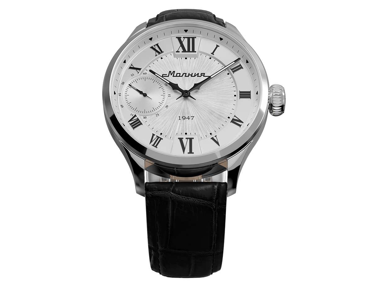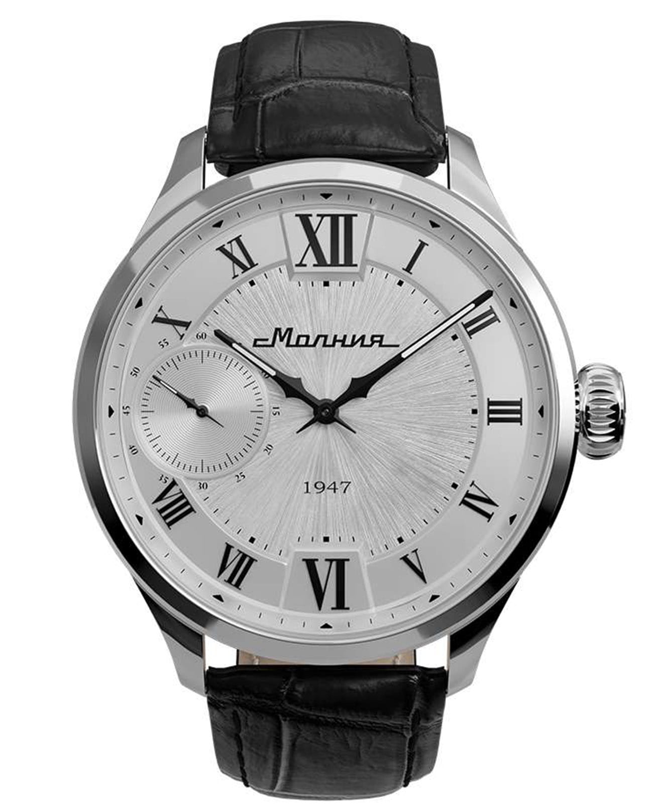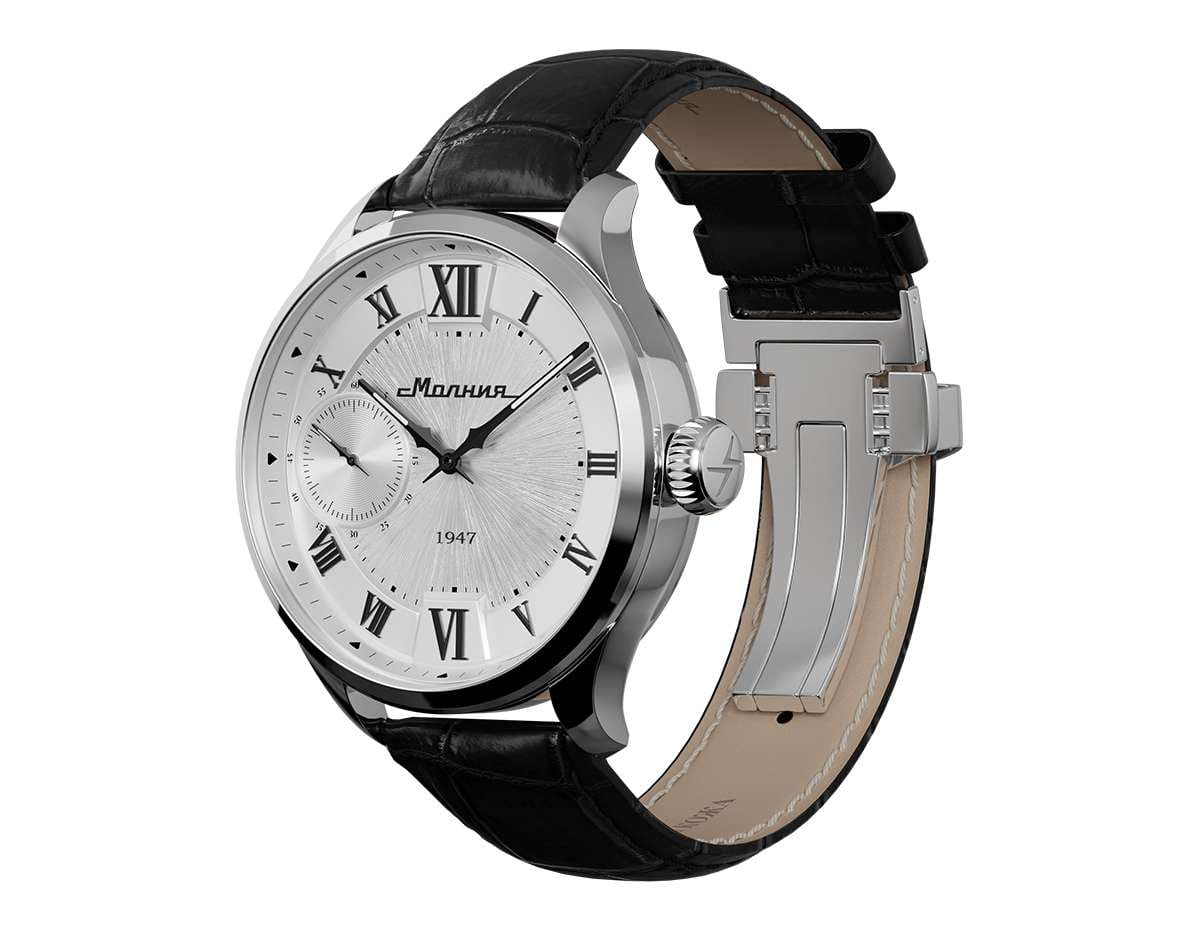 Мужские механические часы с ручным подзаводом — это аксессуар от легендарного бренда «МОЛНИЯ», созданный на Челябинском часовом заводе. Корпус диаметром 41 мм и толщиной 12 мм выполнен из нержавеющей стали 316L с зеркальной полировкой. БезельБезельВнешний ободок, закрепляющий стекло. В спортивных часах так называется поворотное кольцо с делениями на циферблате, выполняет роль таймера – замеряет отрезки времени на шкале. Неподвижный безель – элемент декора. Однонаправленно вращающийся безель на дайверских часах позволяет фиксировать моменты погружения и выныривания на поверхность. также выполнен из стали с зеркальной отделкой. Циферблат белого цвета оформлен римскими цифрами и стальными индексами. Малая секундная стрелка вынесена на позицию 9 часов. Циферблат защищён сапфировым стекломСапфировое стеклоПрочный и надёжный материал из кристалла сапфира синтетического происхождения, характеризующийся особой твёрдостью и устойчивостью к царапинам и повреждениям. толщиной 2,5 мм. Механизм — мануфактурный калибр 3603, собранный вручную, с запасом хода до 40 часов. Прозрачная задняя крышка позволяет наблюдать за работой механизма. Часы оснащены чёрным кожаным ремешком шириной 20 мм с раскладной застёжкойРаскладная застёжкаТакой тип застёжки используется только на браслетах из металла. Она никогда не раскрывается полностью, происходит разделение на 2 и более частей. Раскладывающая застёжка снизит вероятность потери часов к минимуму. и системой быстрой замены. Водонепроницаемость 100 м позволяет использовать часы для плавания и повседневного ношения. Идеальный выбор для тех, кто ценит российское качество и традиции.