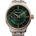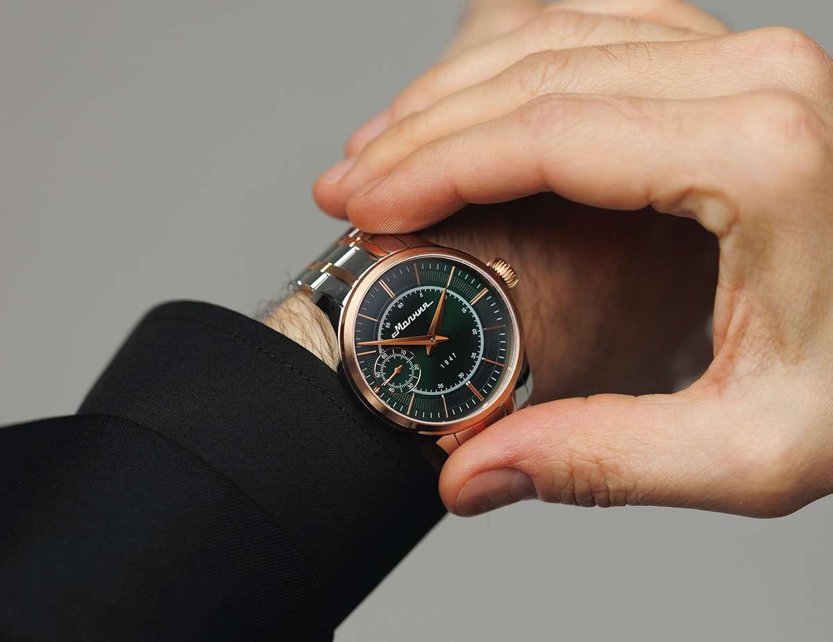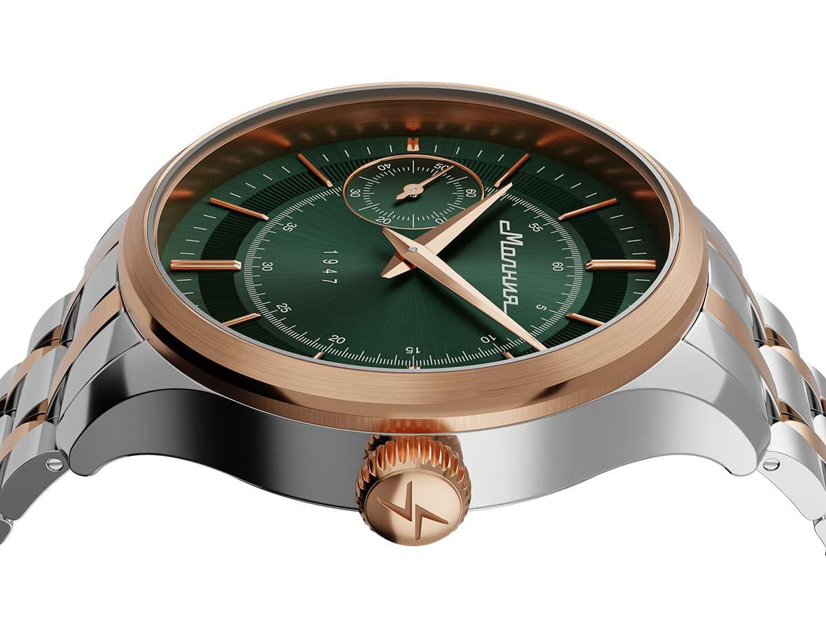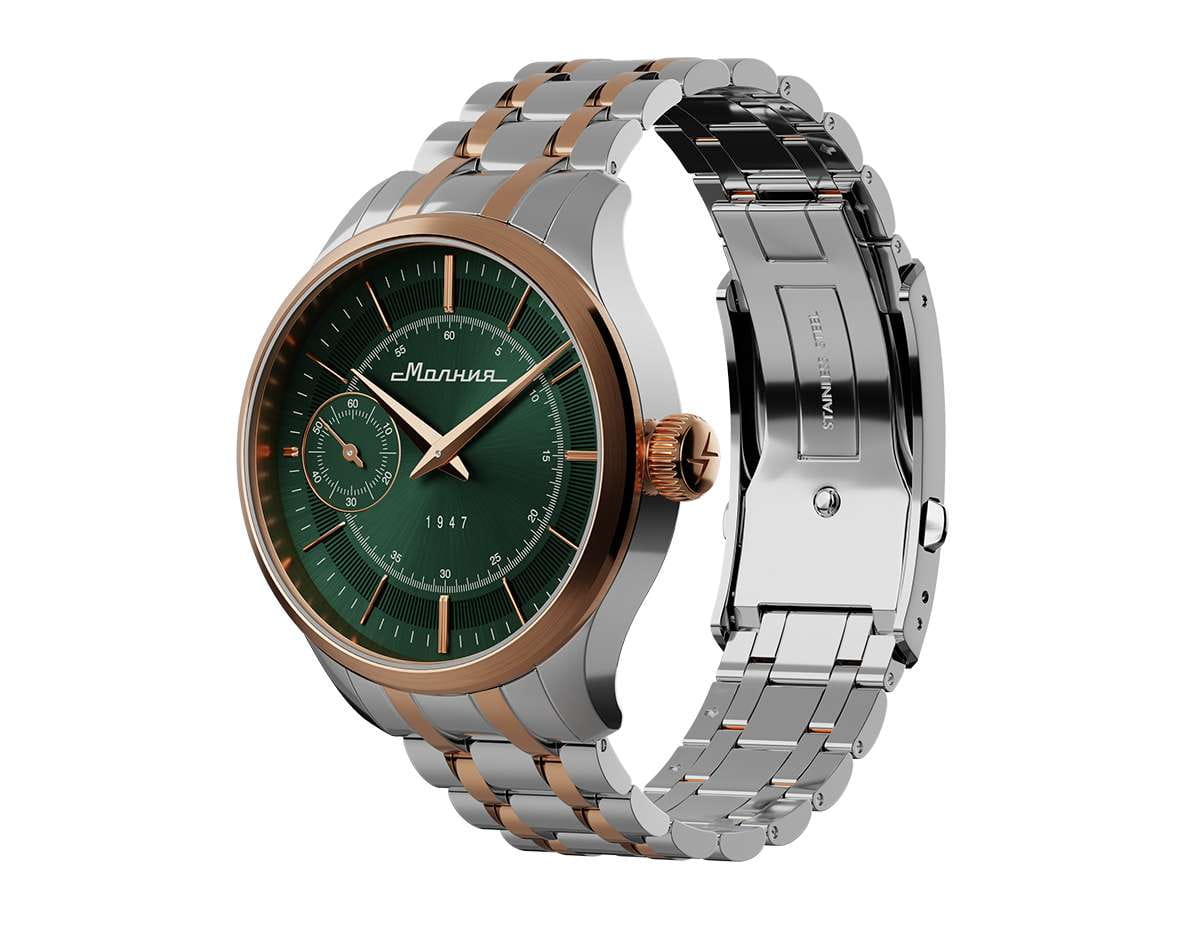 Мужские механические часы с ручным подзаводом — это аксессуар от легендарного бренда «МОЛНИЯ», созданный на Челябинском часовом заводе. Корпус диаметром 41 мм выполнен из нержавеющей стали 316L. БезельБезельВнешний ободок, закрепляющий стекло. В спортивных часах так называется поворотное кольцо с делениями на циферблате, выполняет роль таймера – замеряет отрезки времени на шкале. Неподвижный безель – элемент декора. Однонаправленно вращающийся безель на дайверских часах позволяет фиксировать моменты погружения и выныривания на поверхность. выполнен из стали с PVD-покрытиемPVDУльтратонкое покрытие наносится в технике вакуумного напыления, сочетает в себе нитрид титана особой прочности со слоем золота или оксида хрома. Несёт в себе декоративную или защитную функцию. и зеркальной отделкой. Циферблат зелёного цвета оформлен индексами и стрелками. Малая секундная стрелка вынесена на позицию 9 часов. Циферблат защищён сапфировым стекломСапфировое стеклоПрочный и надёжный материал из кристалла сапфира синтетического происхождения, характеризующийся особой твёрдостью и устойчивостью к царапинам и повреждениям. толщиной 2 мм. Механизм — мануфактурный калибр 3603, собранный вручную, с запасом хода до 40 часов. Прозрачная задняя крышка позволяет наблюдать за работой механизма. Часы оснащены стальным браслетом с частичным PVD-покрытиемPVDУльтратонкое покрытие наносится в технике вакуумного напыления, сочетает в себе нитрид титана особой прочности со слоем золота или оксида хрома. Несёт в себе декоративную или защитную функцию. под золото и системой быстрой замены на раскладной застёжкеРаскладная застёжкаТакой тип застёжки используется только на браслетах из металла. Она никогда не раскрывается полностью, происходит разделение на 2 и более частей. Раскладывающая застёжка снизит вероятность потери часов к минимуму. типа клипса. Водонепроницаемость 50 м позволяет использовать часы в повседневных условиях. Идеальный выбор для тех, кто ценит российское качество и традиции.