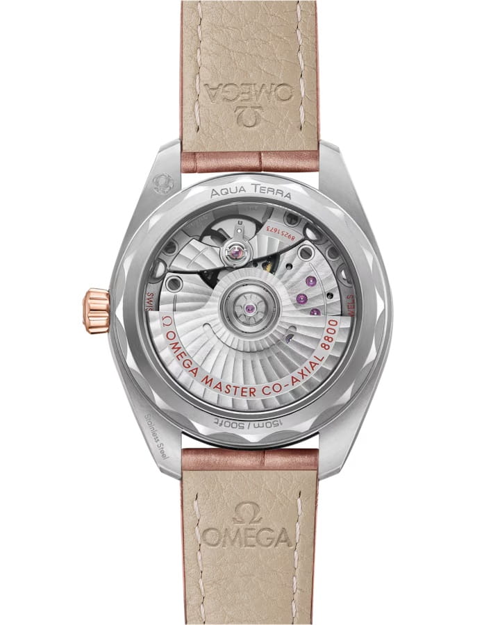 Часы Omega Seamaster Aqua Terra выполнены в симметричном корпусе из нержавеющей стали и 18K Sedna™ золота с завинчивающейся задней крышкой, украшенной волновым узором. Модель дополнена полированным безелем с бриллиантами, что добавляет роскошный акцент. Циферблат золотистого цвета оформлен с использованием волнообразного рисунка и имеет окошко даты на 6 часах. Стрелки выполнены из 18K Sedna™ золота с алмазной полировкой. Часовые метки — 11 бриллиантов в маркизной оправе, что подчёркивает элегантность модели. Калибр Omega 8800 сертифицирован как Master Chronometer — гарантия высочайшей точности и устойчивости к магнитным полям. Запас хода составляет 55 часов. Защиту циферблата обеспечивает сапфировое стеклоСапфировое стеклоПрочный и надёжный материал из кристалла сапфира синтетического происхождения, характеризующийся особой твёрдостью и устойчивостью к царапинам и повреждениям. с антибликовым покрытиемАнтибликовое покрытиеСлой оксида металла в 0,13-0,3 микрон, благодаря которому стекло часов не бликует и не отражает свет. Антибликовое покрытие уменьшает отражение света в 10 раз, обеспечивая отличную читаемость показателей циферблата. с обеих сторон. Водозащита позволяет использовать часы в воде без риска повреждения. Часы установлены на кожаный ремешок бежевого цвета. Это сочетание премиального качества, технологичности и классического дизайна.