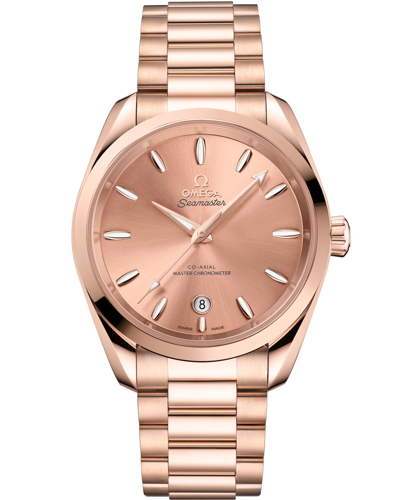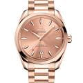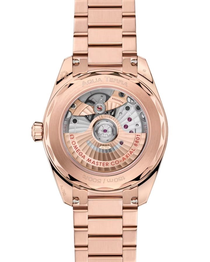 Omega Seamaster Aqua Terra выполнены в симметричном корпусе из полированного 18K Sedna™ золота с завинчивающейся задней крышкой, украшенной волновым узором. Циферблат дополнен окошком даты на 6 часах, окаймлённым кольцом из 18K Sedna™ золота. Стрелки и метки выполнены из 18K Sedna™ золота и оснащены люминесцентным покрытиемЛюминесцентное покрытиеПозволяет считывать показания времени в темноте. Производители наносят на стрелки, часовые индексы, безель или поверхность циферблата светонакопительный состав, дающий холодное свечение. Super-LumiNova для лучшей читаемости в темноте. Индексы выполнены в форме корпусов парусников — деталь, подчёркивающая морское наследие коллекции. Калибр Omega 8801 сертифицирован как Master Chronometer — гарантия высочайшей точности и устойчивости к магнитным полям. Запас хода составляет 55 часов. Защиту циферблата обеспечивает сапфировое стеклоСапфировое стеклоПрочный и надёжный материал из кристалла сапфира синтетического происхождения, характеризующийся особой твёрдостью и устойчивостью к царапинам и повреждениям. с антибликовым покрытиемАнтибликовое покрытиеСлой оксида металла в 0,13-0,3 микрон, благодаря которому стекло часов не бликует и не отражает свет. Антибликовое покрытие уменьшает отражение света в 10 раз, обеспечивая отличную читаемость показателей циферблата. с обеих сторон. Водозащита позволяет использовать часы в воде без риска повреждения. Часы установлены на браслет из 18K Sedna™ золота с раскладной застёжкойРаскладная застёжкаТакой тип застёжки используется только на браслетах из металла. Она никогда не раскрывается полностью, происходит разделение на 2 и более частей. Раскладывающая застёжка снизит вероятность потери часов к минимуму.. Это сочетание премиального качества, технологичности и классического дизайна.
