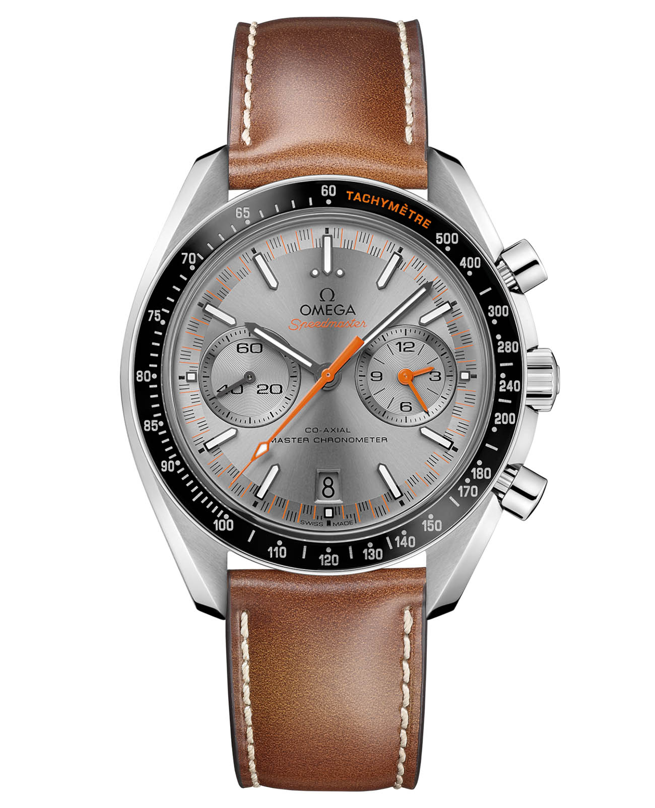 Speedmaster Racing Master Chronometer в 44,25-мм корпусе из нержавеющей стали с коричневым кожаным ремешком представляет собой гармоничное сочетание автоспортивной эстетики и часового искусства. Черное керамическое кольцоБезельВнешний ободок, закрепляющий стекло. В спортивных часах так называется поворотное кольцо с делениями на циферблате, выполняет роль таймера – замеряет отрезки времени на шкале. Неподвижный безель – элемент декора. Однонаправленно вращающийся безель на дайверских часах позволяет фиксировать моменты погружения и выныривания на поверхность. с тахиметрической шкалойТахиметрРазмеченная шкала, располагается на ободке или безеле часов. Тахиметр позволяет рассчитать скорость на определённом участке пути, расстояние измеряется в километрах или милях. эффектно сочетает оранжевые надписи с высокотехнологичными цифрами из Liquidmetal™. Серый циферблат с радиальным сатинированием и характерной "спидометрной" минутной шкалой дополнен двумя счетчиками с родиевыми кольцами и окошком даты на 6 часах. Черненые и оранжевые стрелки создают выразительный контраст с чернеными индексами в форме стрел, покрытыми Super-LumiNovaЛюминесцентное покрытиеПозволяет считывать показания времени в темноте. Производители наносят на стрелки, часовые индексы, безель или поверхность циферблата светонакопительный состав, дающий холодное свечение.. В основе часов - прецизионный калибр OMEGA Co-Axial Master Chronometer 9900, сертифицированный институтом METAS, что гарантирует безупречную точность и надежность.