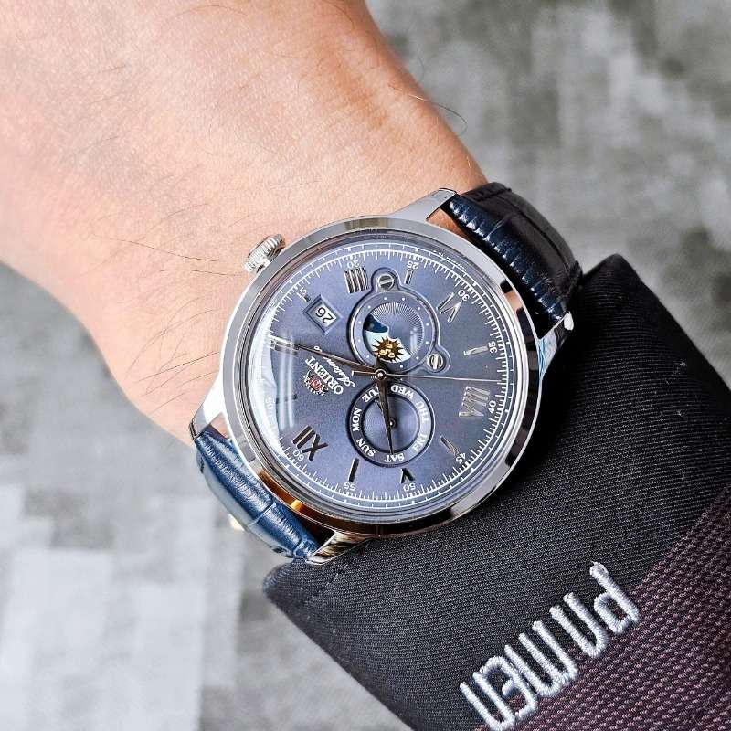 Оригинальные механические часы Orient Bambino RA-AK0806L представляют собой элегантное сочетание классического дизайна и современных технологий. Корпус диаметром 41,5 мм изготовлен из нержавеющей стали, что обеспечивает долговечность и привлекательный внешний вид. Циферблат синего цвета оснащён функцией день/ночь, которая отображает фазы Луны и время суток, добавляя уникальный шарм модели. Часы также оснащены функцией отображения даты в районе 3 часа, от отдельным циферблатом с днями недели, добавляя практичности к своему классическому дизайну. Часы защищены минеральным стекломМинеральное стеклоМинеральное стекло представляет собой искусственно выращенный минерал кварца. Такое стекло отличается особой устойчивостью к повреждениям и царапинам. Уступает по некоторым качествам сапфировому стеклу., обеспечивающим устойчивость к царапинам и надёжную защиту циферблата. Водозащита WR 30 (3 ATM) делает эти часы практичным выбором для повседневного использования. Дополняет образ синий кожаный ремешок, который не только стильный, но и комфортный для длительного ношения. Вес часов составляет всего 70 грамм, что делает их лёгкими и удобными для использования каждый день. Orient Bambino RA-AK0806L — это выбор тех, кто ценит точность, качество и уникальный дизайн в одном аксессуаре. Эти часы станут прекрасным дополнением как к повседневной, так и к формальной одежде, подчеркивая ваш стиль и индивидуальность.