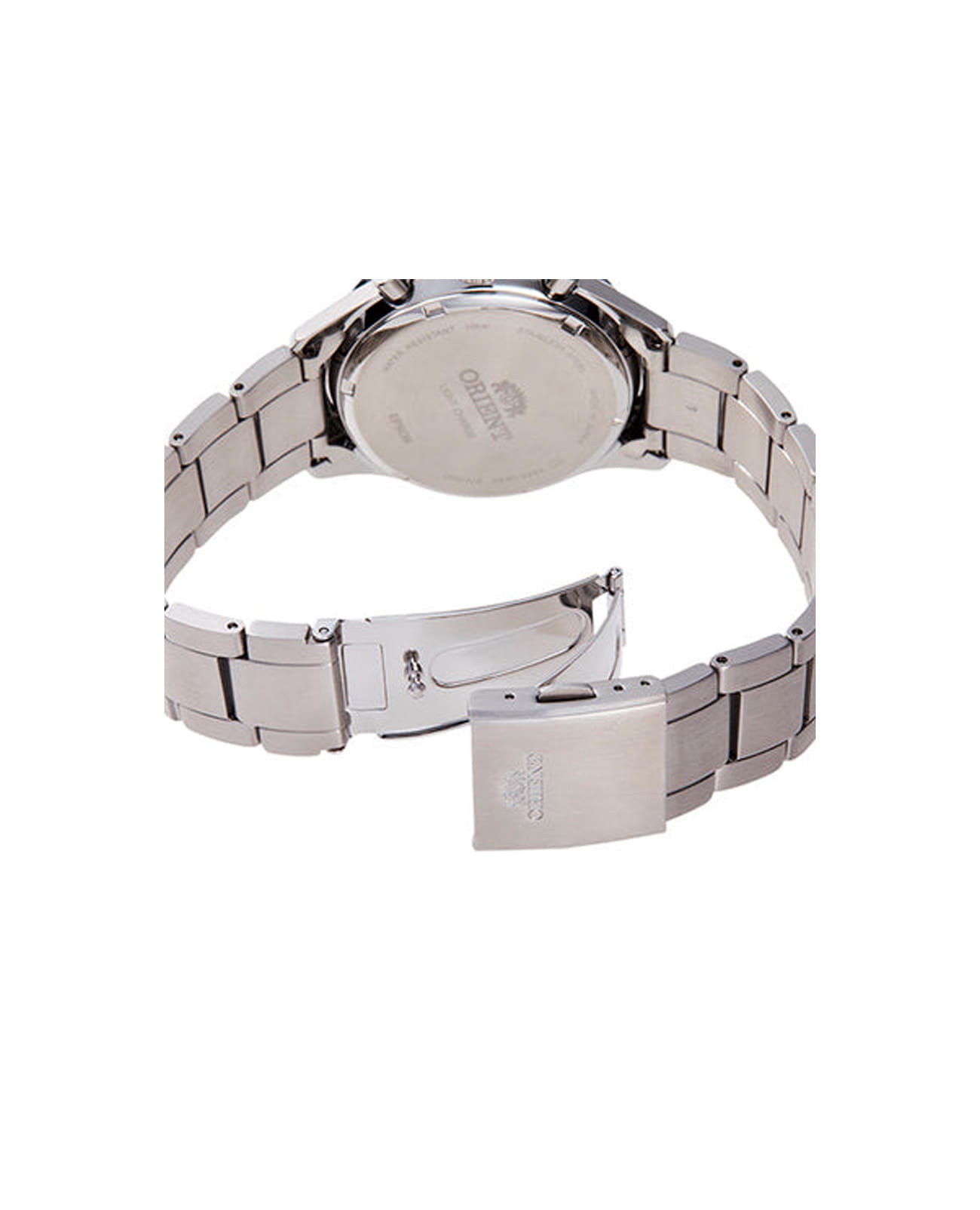 Часы Orient RA-TY0003L представляют собой модель из коллекции Chronograph, сочетающую в себе современный дизайн и функциональность. Это мужские кварцевые часы с солнечной подзарядкой, оснащённые калибром KSA00. Точность хода составляет ±15 секунд в месяц, а запас хода при полной зарядке достигает 6 месяцев, что делает их удобными для повседневного использования. Корпус часов выполнен из нержавеющей стали и имеет диаметр 42,9 мм при толщине 11,5 мм. Водонепроницаемость модели составляет 100 метров (10 бар), что позволяет использовать их для плавания, но не для глубоководного дайвинга. Часы оснащены минеральным стекломМинеральное стеклоМинеральное стекло представляет собой искусственно выращенный минерал кварца. Такое стекло отличается особой устойчивостью к повреждениям и царапинам. Уступает по некоторым качествам сапфировому стеклу., устойчивым к царапинам, и винтовой задней крышкой, обеспечивающей герметичность. Циферблат выполнен в синем цвете с аналоговым дисплеем. На циферблате расположены: 24-часовой индикатор, 60-минутный счётчик и малая секундная стрелка. Также предусмотрено окно даты, что добавляет часам функциональности. Браслет часов изготовлен из нержавеющей стали и имеет ширину 20 мм. Застёжка выполнена  на раскладной застёжкеРаскладная застёжкаТакой тип застёжки используется только на браслетах из металла. Она никогда не раскрывается полностью, происходит разделение на 2 и более частей. Раскладывающая застёжка снизит вероятность потери часов к минимуму..