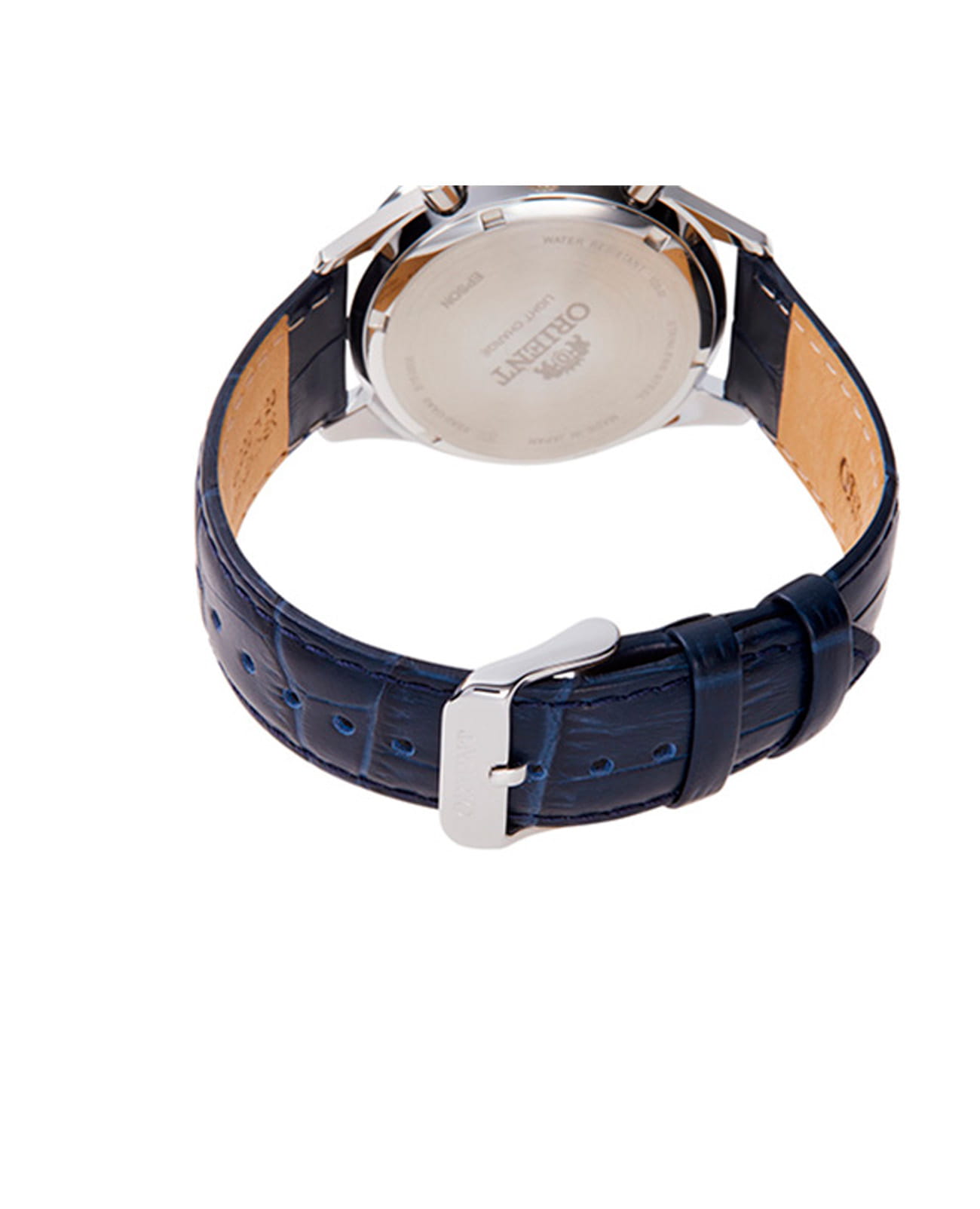 Часы Orient RA-TY0004L представляют собой модель из коллекции Contemporary, сочетающую в себе современный дизайн и функциональность. Это мужские кварцевые часы с солнечной подзарядкой, оснащённые калибром KSA00. Точность хода составляет ±15 секунд в месяц, а запас хода при полной зарядке достигает 6 месяцев, что делает их удобными для повседневного использования. Корпус часов выполнен из нержавеющей стали и имеет диаметр 42,9 мм при толщине 11,5 мм. Водонепроницаемость модели составляет 100 метров (10 бар), что позволяет использовать их для плавания, но не для глубоководного дайвинга. Часы оснащены минеральным стекломМинеральное стеклоМинеральное стекло представляет собой искусственно выращенный минерал кварца. Такое стекло отличается особой устойчивостью к повреждениям и царапинам. Уступает по некоторым качествам сапфировому стеклу., устойчивым к царапинам, и винтовой задней крышкой, обеспечивающей герметичность. Циферблат выполнен в синем цвете с аналоговым дисплеем. На циферблате расположены: 24-часовой индикатор, 60-минутный счётчик и малая секундная стрелка. Также предусмотрено окно даты, что добавляет часам функциональности. Функционал часов включает хронографХронографФункция позволяет измерять отрезки времени с особой точностью: часы, минуты, секунды. Верным признаком хронографа является наличие на циферблате 3 дополнительных окошек-счётчиков., который позволяет измерять интервалы времени с точностью до 1/5 секунды, а также будильник и отображение даты. Браслет часов изготовлен из кожи синего цвета, что придаёт часам классический и элегантный вид. Ремешок на стандартной застежке, что обеспечивает удобство и надёжную фиксацию на запястье.