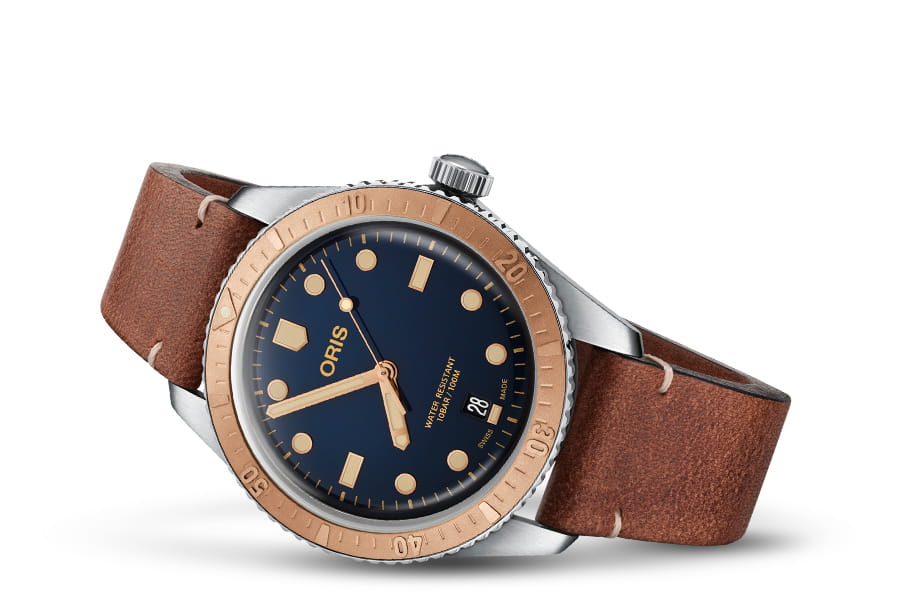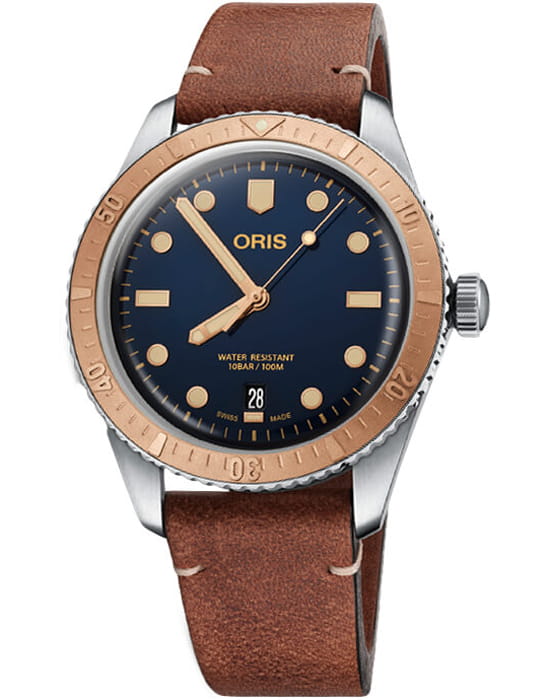 Многокомпонентный корпус из бронзы и стали, вращающийся безельБезельВнешний ободок, закрепляющий стекло. В спортивных часах так называется поворотное кольцо с делениями на циферблате, выполняет роль таймера – замеряет отрезки времени на шкале. Неподвижный безель – элемент декора. Однонаправленно вращающийся безель на дайверских часах позволяет фиксировать моменты погружения и выныривания на поверхность. с минутной шкалой . Сапфировое стеклоСапфировое стеклоПрочный и надёжный материал из кристалла сапфира синтетического происхождения, характеризующийся особой твёрдостью и устойчивостью к царапинам и повреждениям., выпуклое с обеих сторон, внутреннее антибликовое покрытие. Прозрачная задняя крышка из сапфирового стеклаСапфировое стеклоПрочный и надёжный материал из кристалла сапфира синтетического происхождения, характеризующийся особой твёрдостью и устойчивостью к царапинам и повреждениям.. Стрелки и метки с люминесцентным покрытиемЛюминесцентное покрытиеПозволяет считывать показания времени в темноте. Производители наносят на стрелки, часовые индексы, безель или поверхность циферблата светонакопительный состав, дающий холодное свечение.. Завинчивающаяся заводная головка.